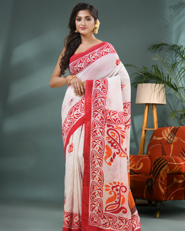 Exquisite Pure Cotton White Saree with Red Ethnic Block Prints and Border