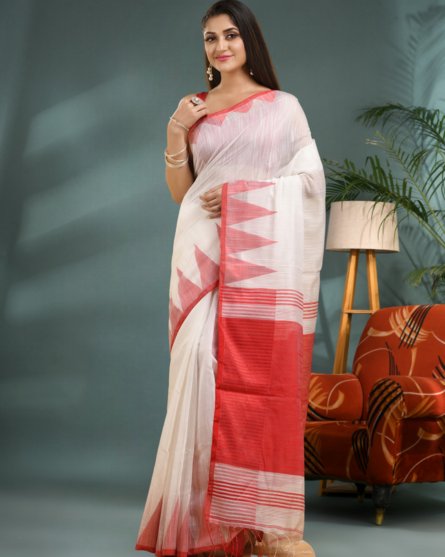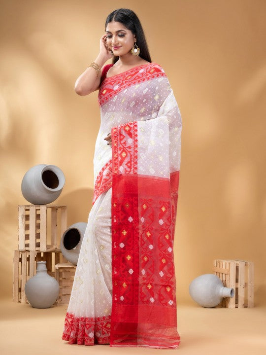 Exquisite Red & White Woven Jamdani Saree with Solid Border