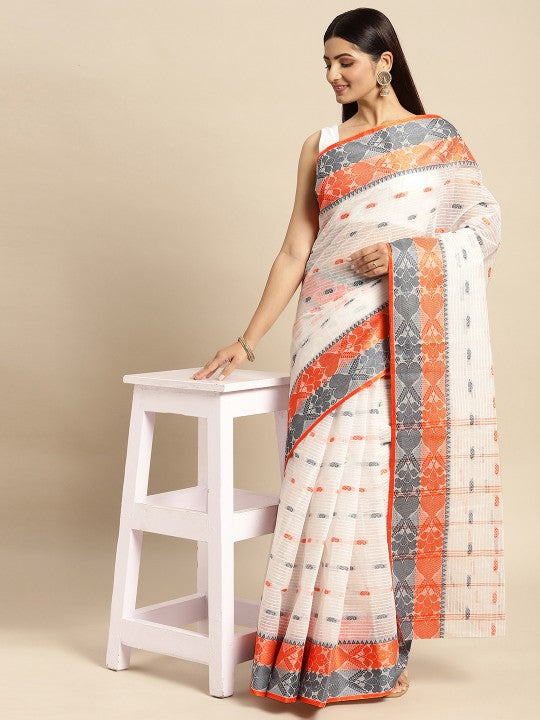 Orange & White Pure Cotton Madhabilata Print Design Saree