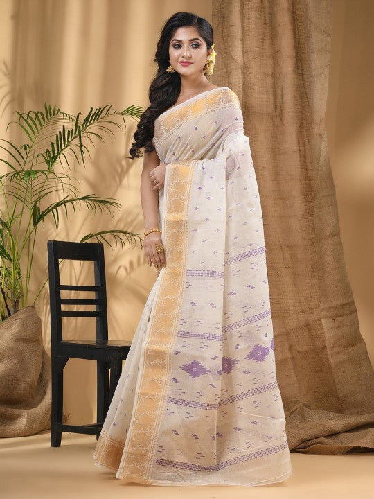 White Pure Cotton Taant Saree with Ethnic Motifs and Woven Design Border