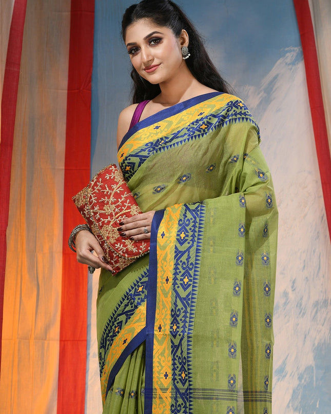 Exquisite Jamdani Cotton Blend Saree: Orange & Green Ethnic Motifs with Solid Border