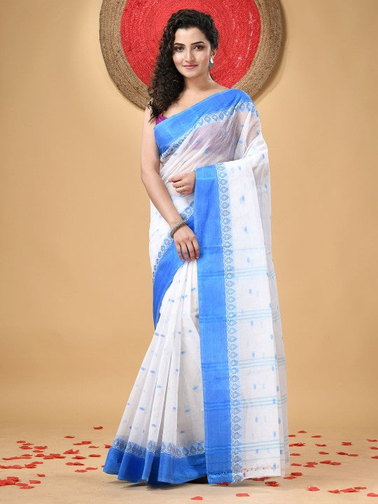 Exquisite White & Blue Pure Cotton Taant Saree with Lotus Bud Woven Design