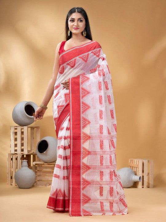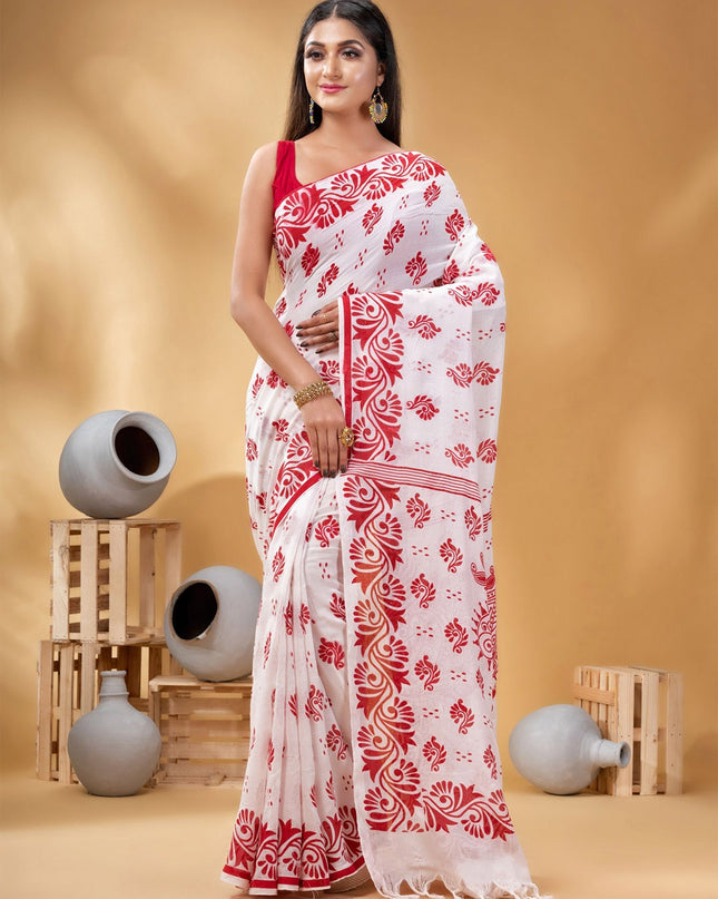 Exquisite Red & White Woven Design Jamdani Saree with Elegant Floral Patterns