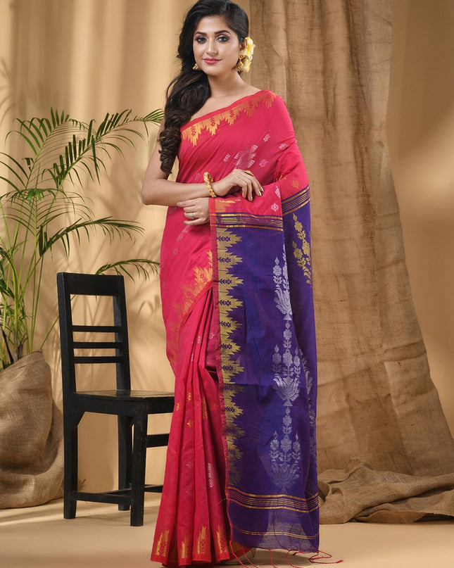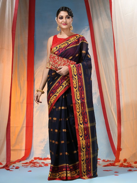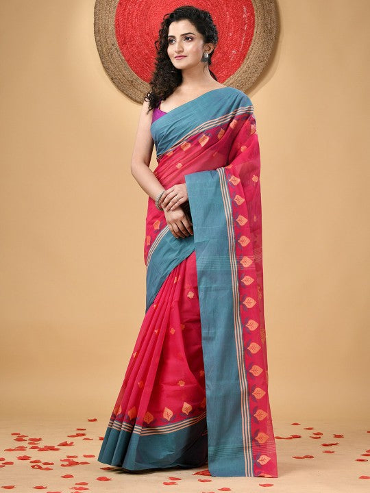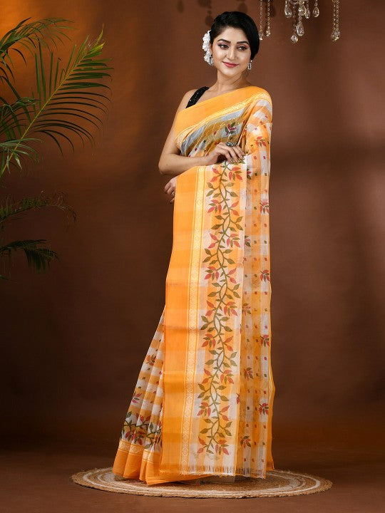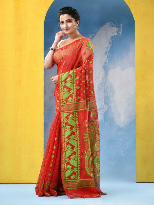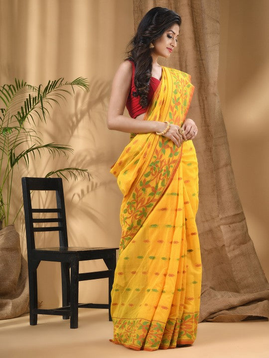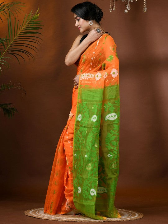 Traditional Tamarind Leaf Resham Dhakai Jamdani Pure Cotton Handloom Saree without Blouse Piece