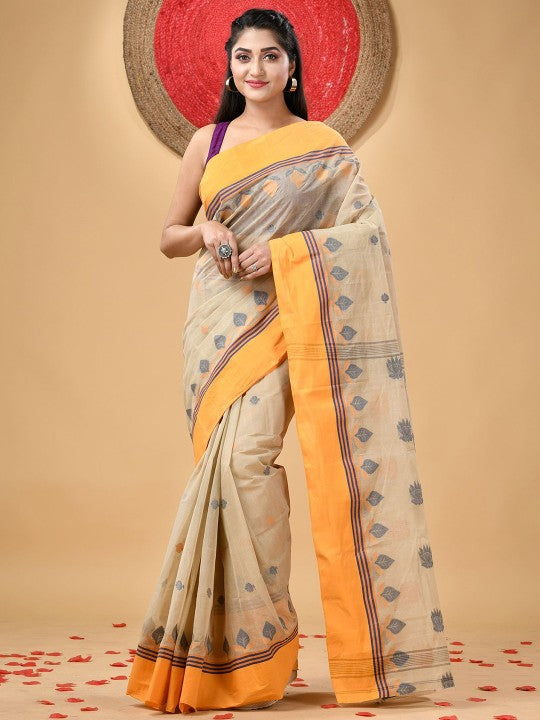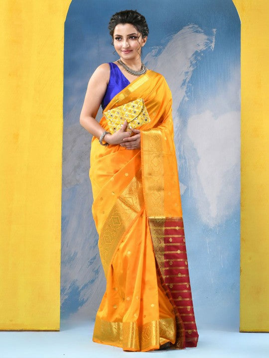 Bengal Woven Handloom Cotton Silk Blend Saree with Blouse Piece (Orange Khaki)