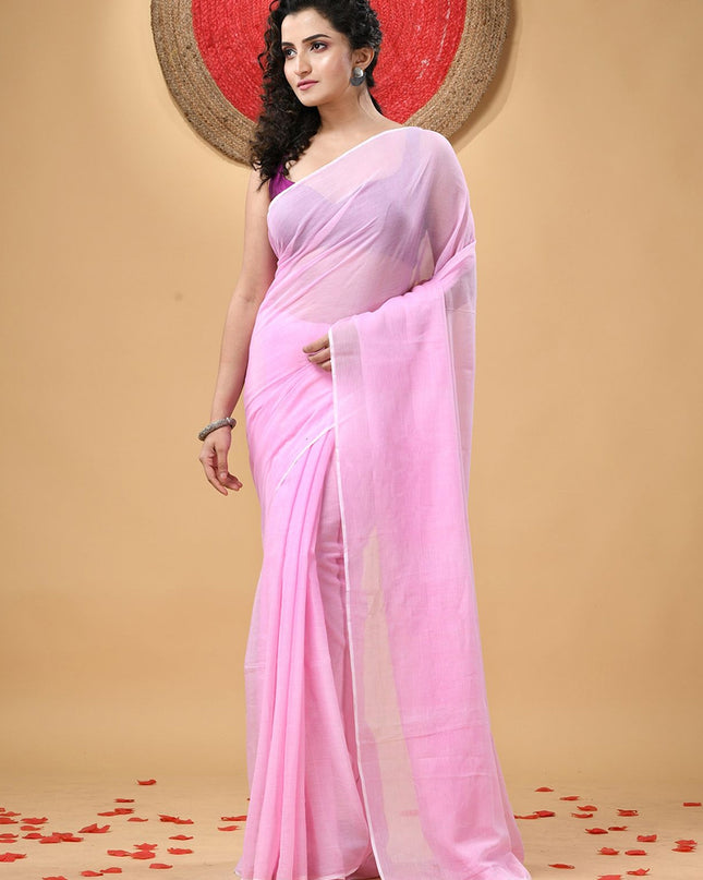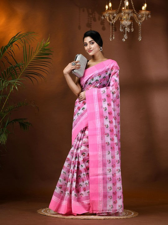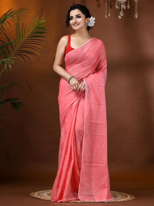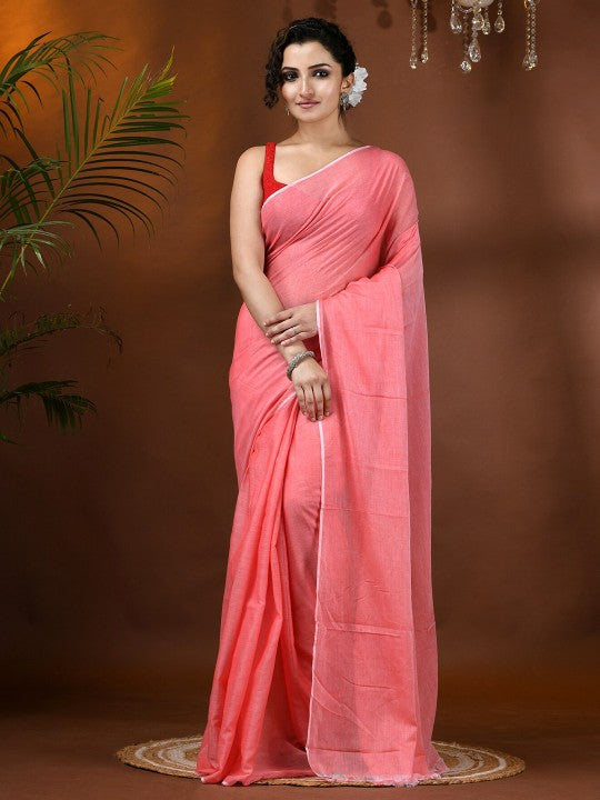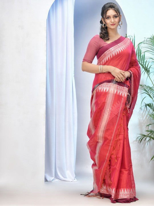 Bengal Ghicha Handloom Cotton Silk Saree With Blouse Piece (Orange Pink White)
