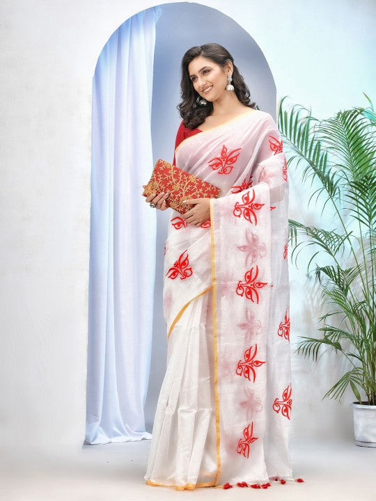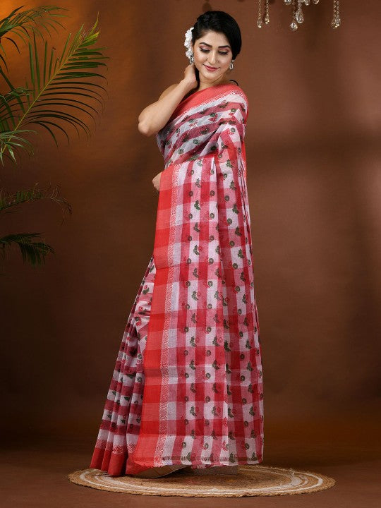 Traditional Tant Pure Cotton Handloom Saree LalKamal Design Without Blouse Piece (Red White)