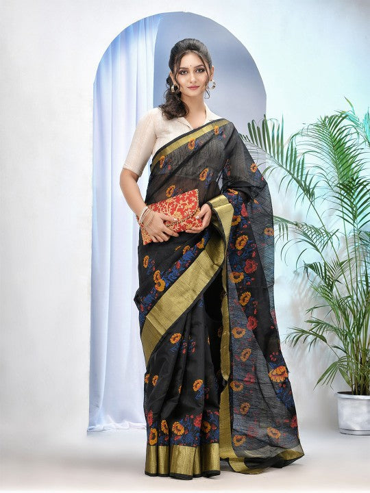Exquisite Floral Printed Black & Gold Zari Border Saree for Women