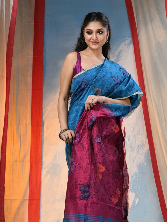 Exquisite Yellow and Blue Handloom Saree with Butterfly Print and Cotton Blend Fabric