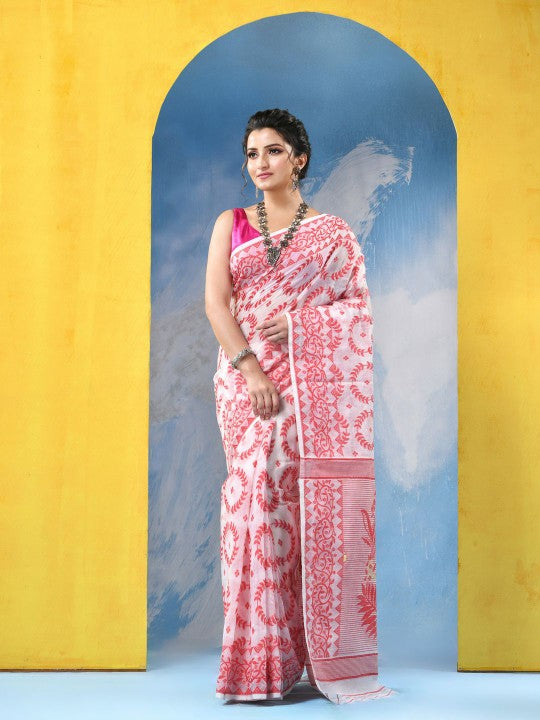 Exquisite Red & White Woven Design Jamdani Saree with Elegant Floral Patterns