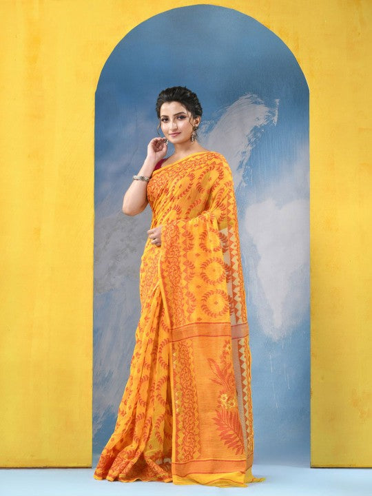 Yellow & Orange Ethnic Motifs Jamdani Cotton Blend Saree with Blouse Piece