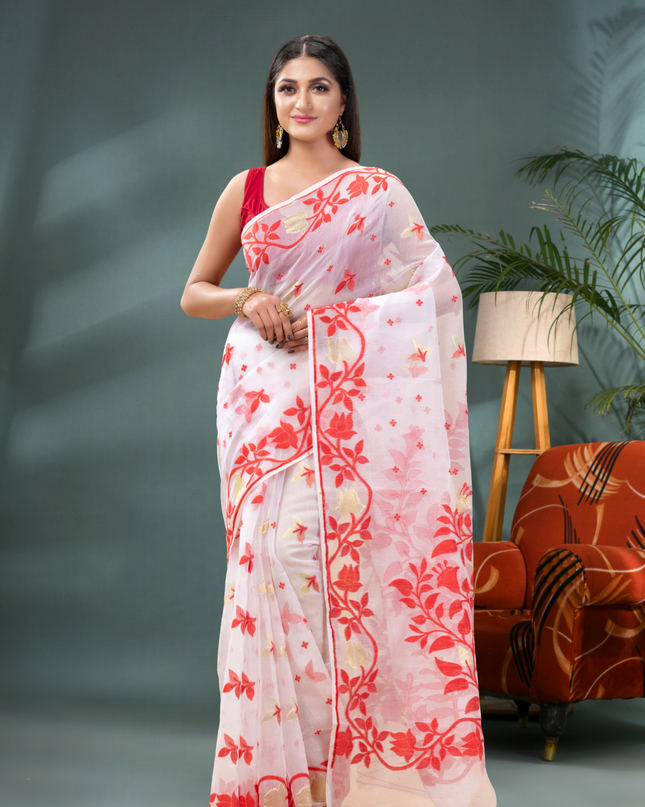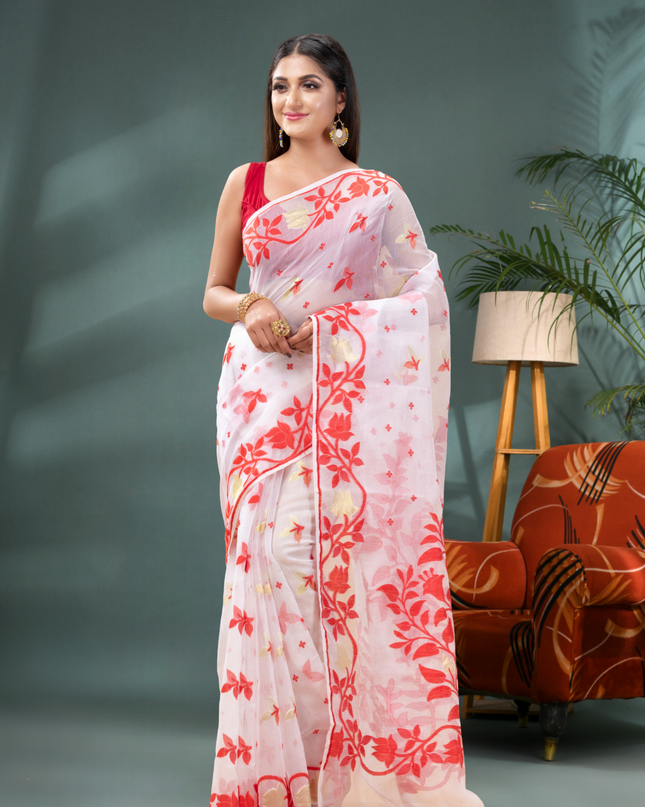 White and Red Floral Woven Design Jamdani Saree for Women