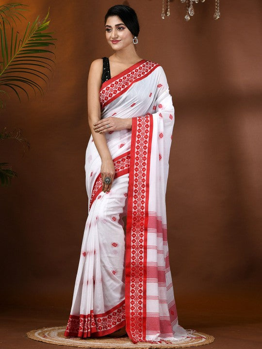 Exquisite White & Red Woven Design Pure Cotton Taant Saree for Women