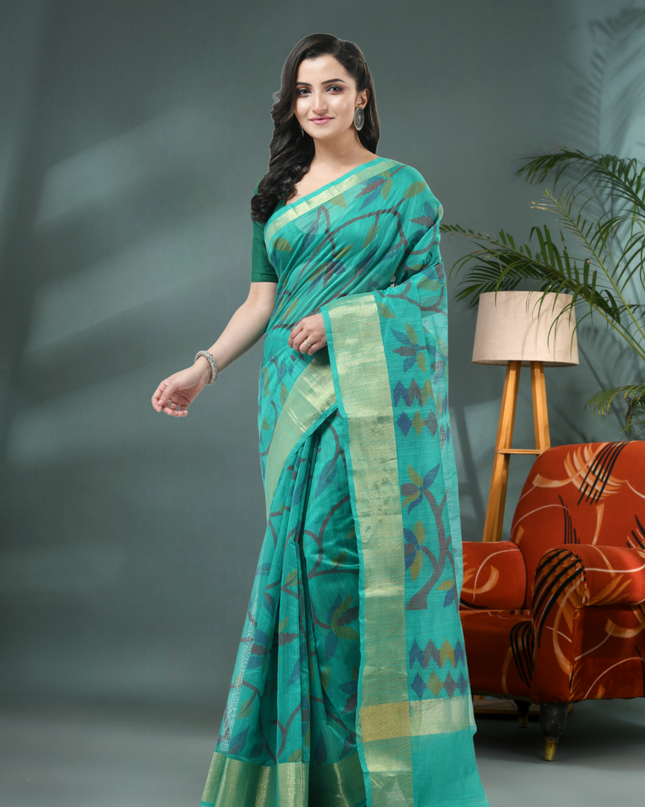 Women's Cotton Silk Handloom Saree - Firoza Floral Leaf Design with Blouse Piece