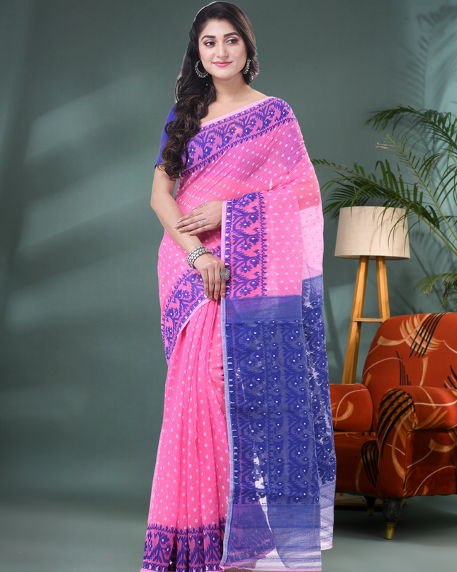 Women’s Bengal Handloom Soft Dhakai Jamdani Cotton Saree – Pink White