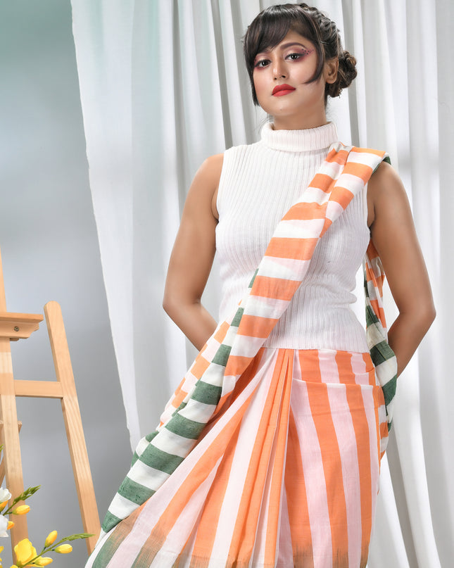 Women’s Tri-Color Tant Cotton Saree Stripe Design with Blouse Piece – Independence Day Edition