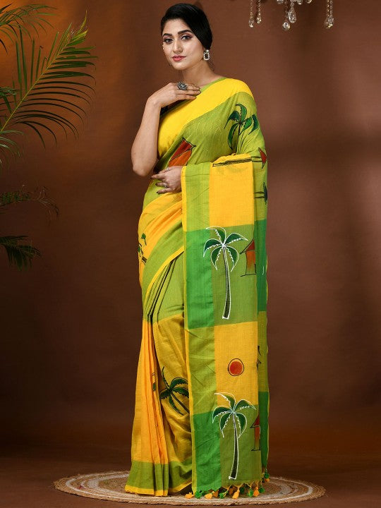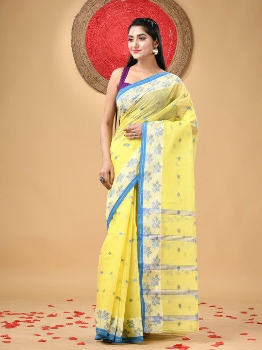 Yellow-Green Woven Design Silk Cotton Taant Saree for Women