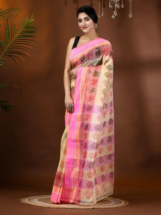 Pink & White Pure Cotton Taant Saree with Ethnic Motifs