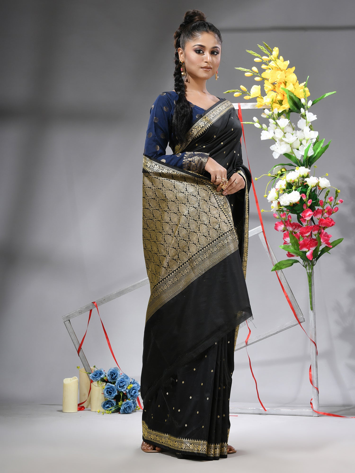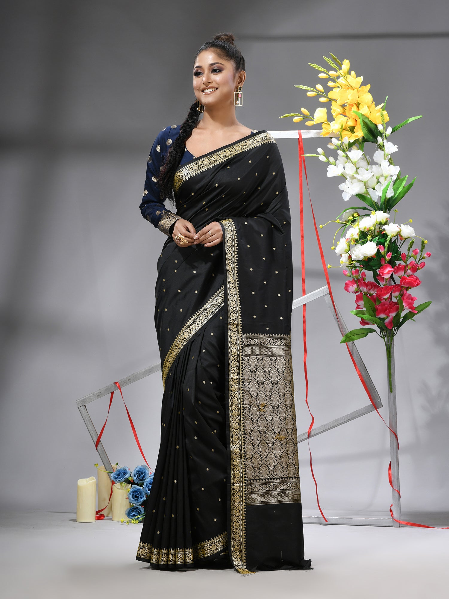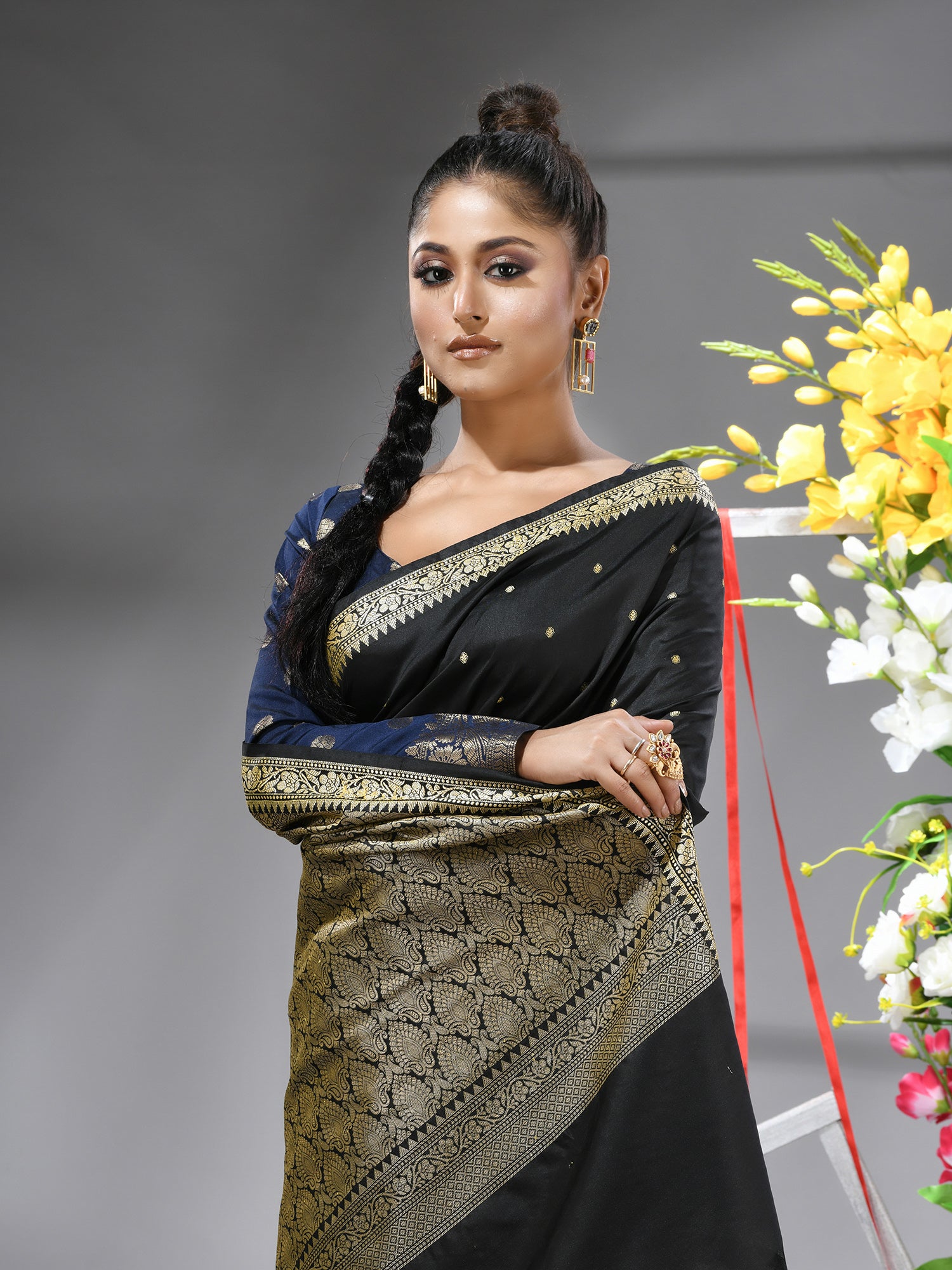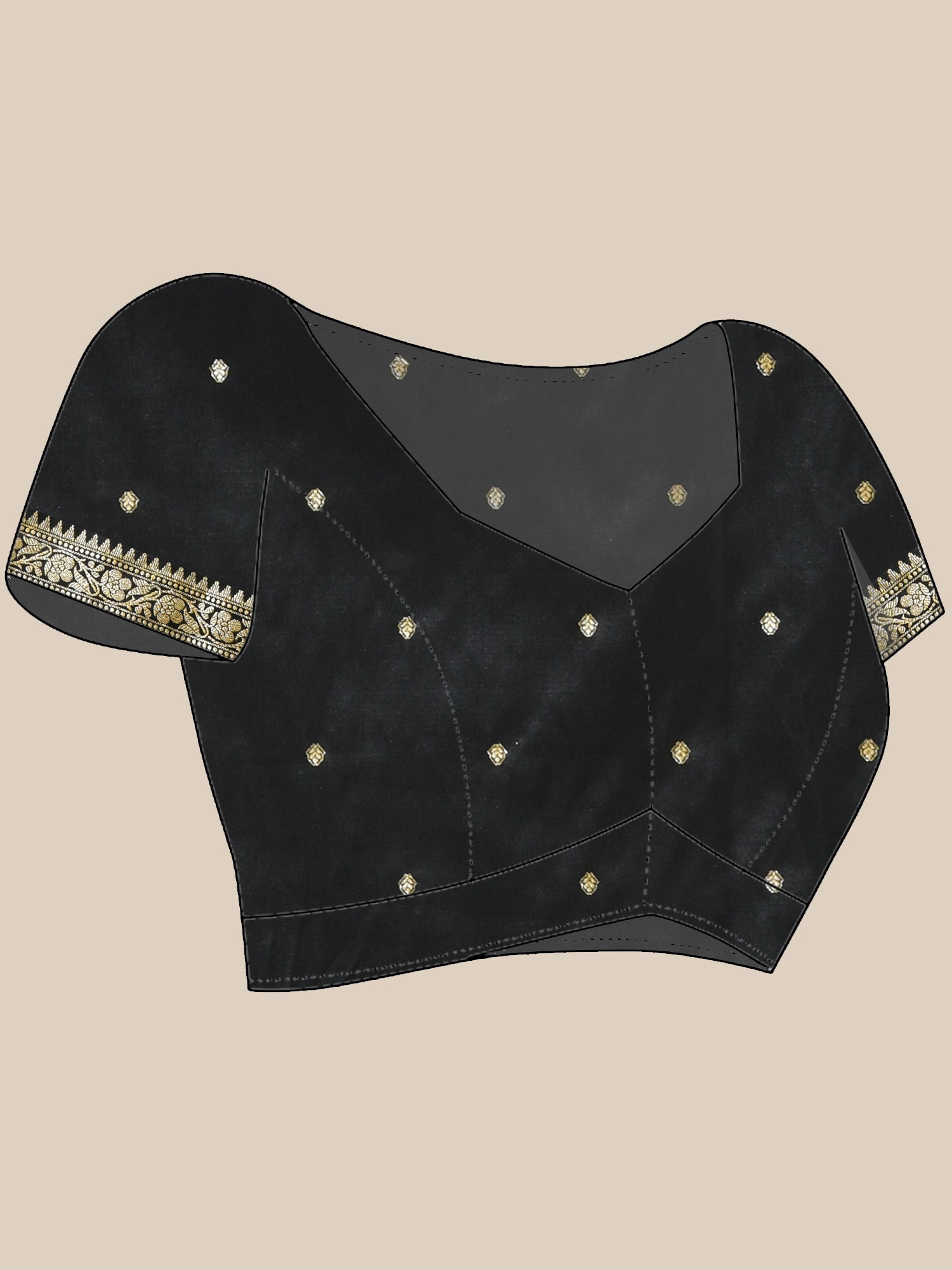 Exude unmatched sophistication with the DESH BIDESH Black Kanjivaram Kanchipuram Silk Blend Saree. This striking piece embodies timeless elegance, blending its classic black hue with the rich heritage of Kanjivaram silk sarees and Kanchipuram sarees. Adorned with delicate silver zari butti work throughout its luxurious jacquard weave, this saree is a masterpiece of traditional artistry. Crafted from a pure silk blend, it offers an elegant drape and an opulent feel. Perfect as a statement wedding saree, a chic black saree for special occasions, or a treasured addition to your collection of pure silk sarees. Comes complete with a matching blouse piece.