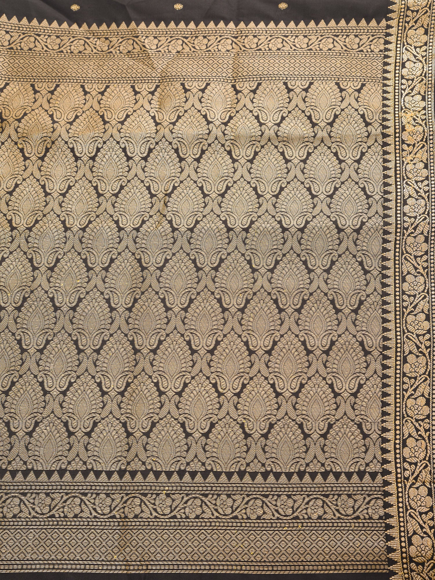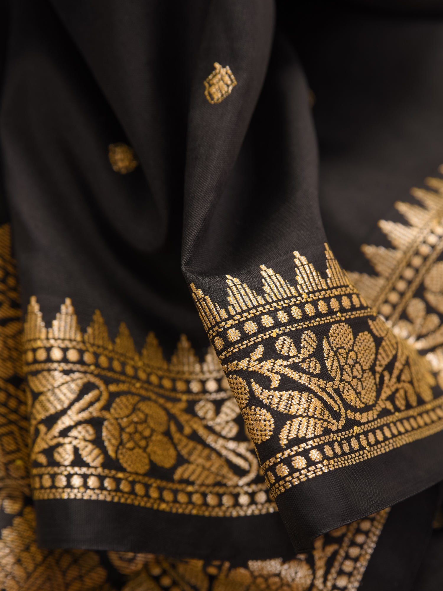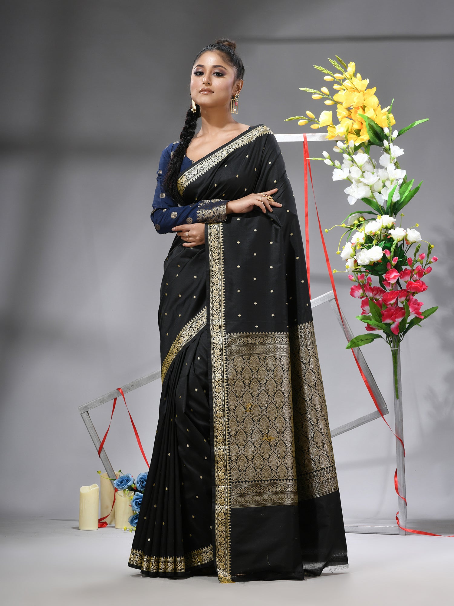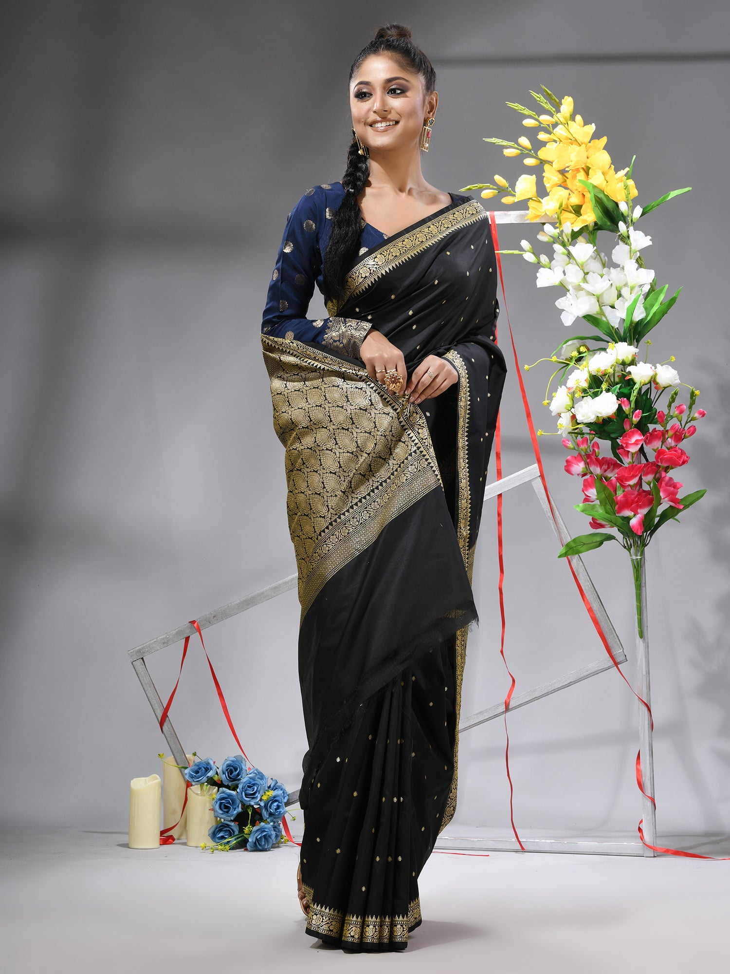 Exude unmatched sophistication with the DESH BIDESH Black Kanjivaram Kanchipuram Silk Blend Saree. This striking piece embodies timeless elegance, blending its classic black hue with the rich heritage of Kanjivaram silk sarees and Kanchipuram sarees. Adorned with delicate silver zari butti work throughout its luxurious jacquard weave, this saree is a masterpiece of traditional artistry. Crafted from a pure silk blend, it offers an elegant drape and an opulent feel. Perfect as a statement wedding saree, a chic black saree for special occasions, or a treasured addition to your collection of pure silk sarees. Comes complete with a matching blouse piece.