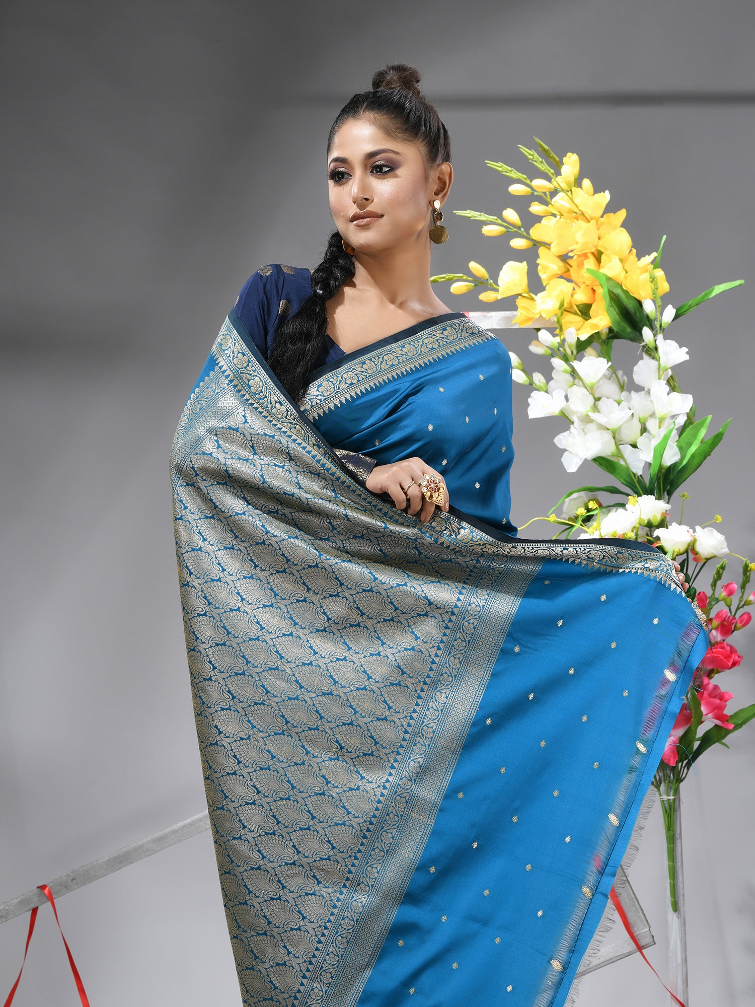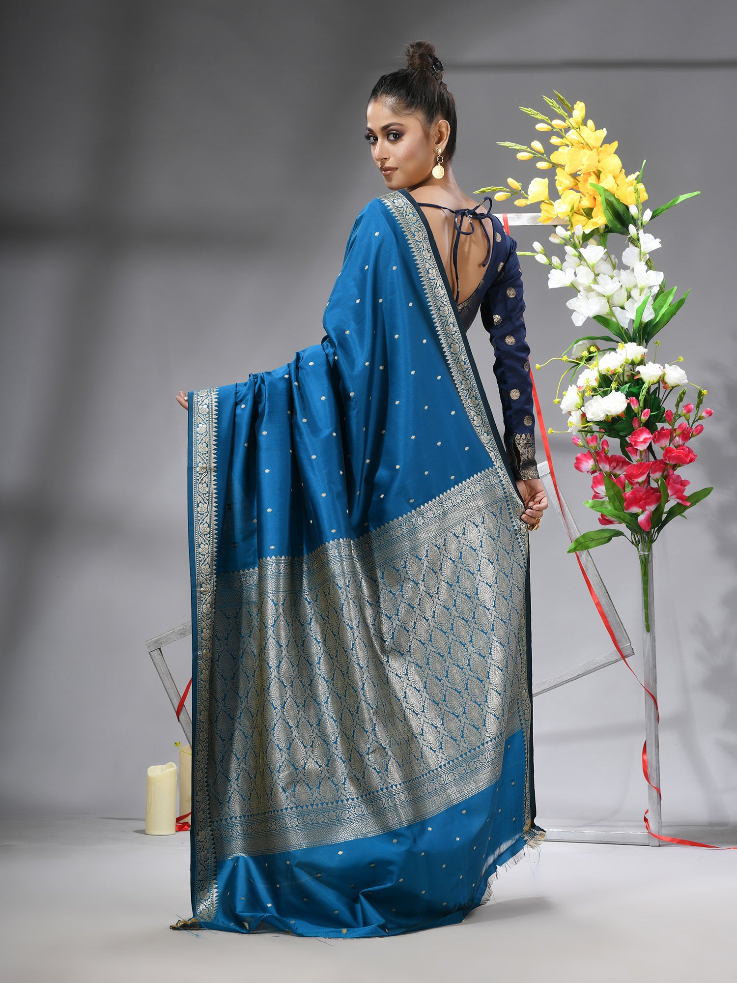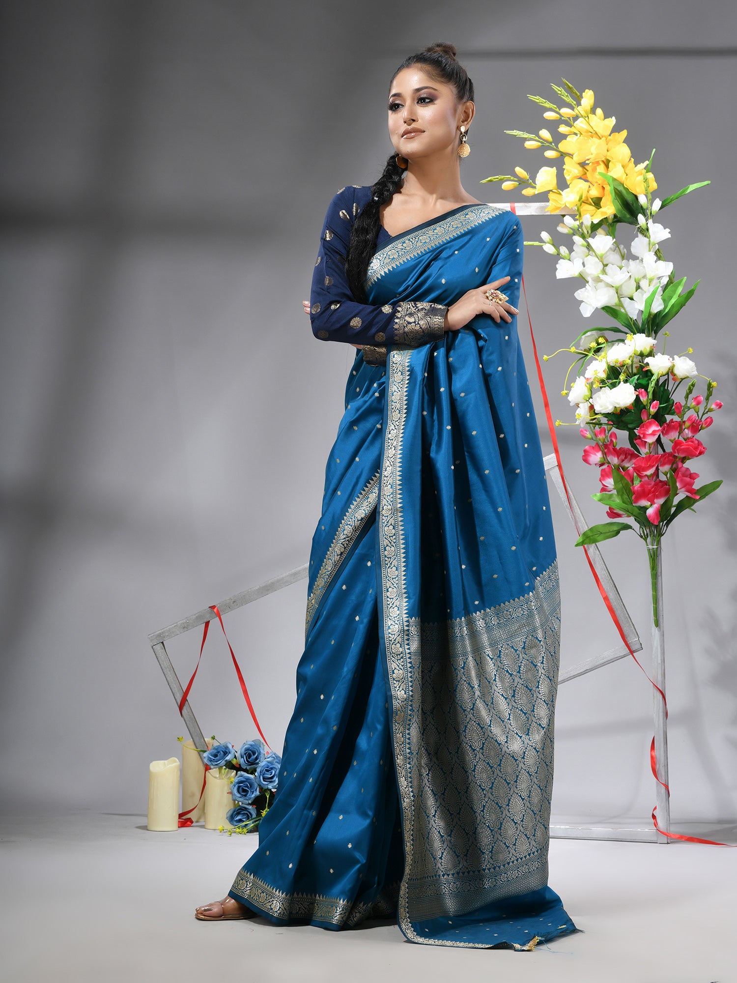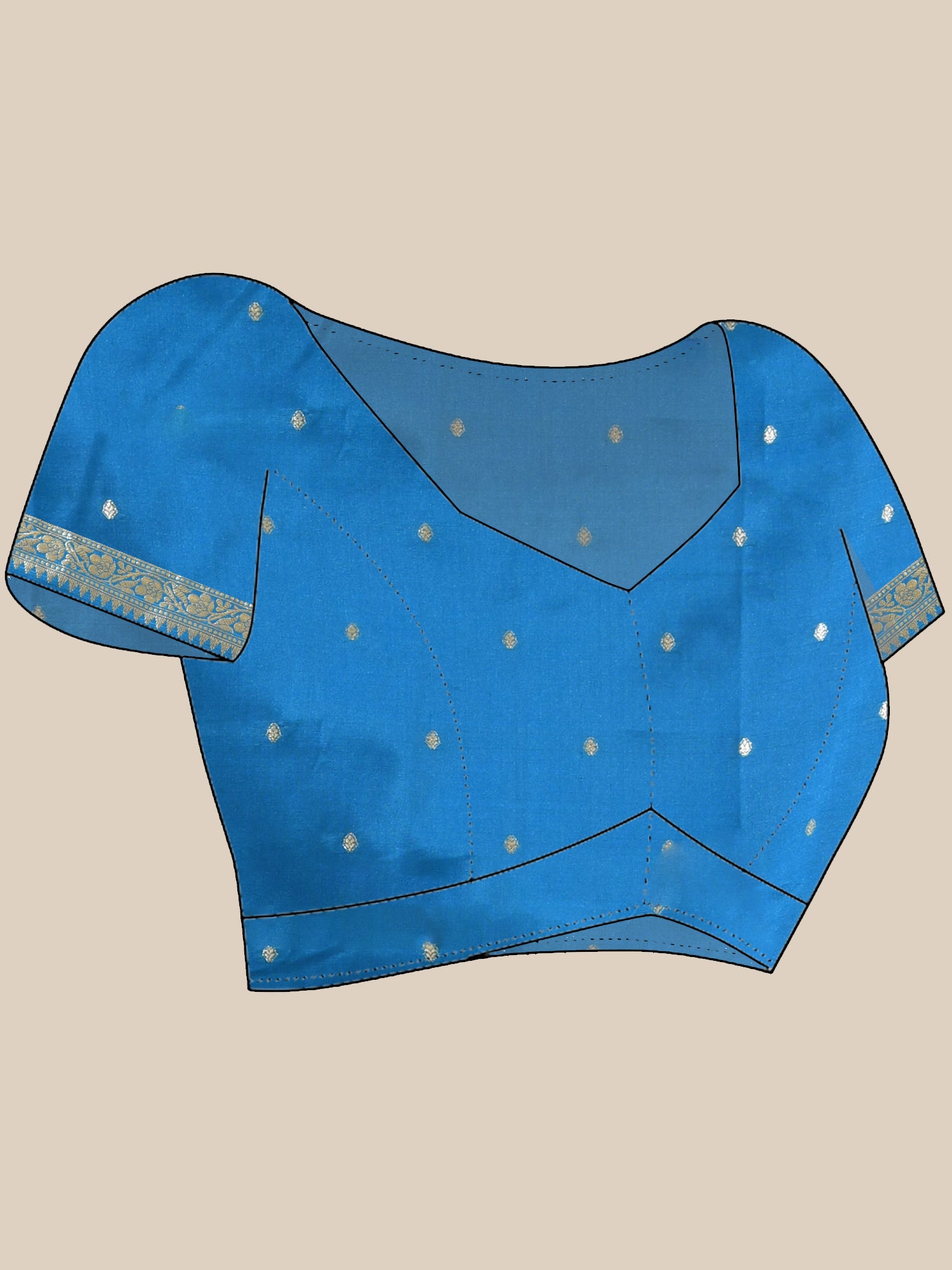 Immerse yourself in the captivating allure of the DESH BIDESH Blue Kanjivaram Kanchipuram Silk Blend Saree. This exquisite piece weaves together the tranquil beauty of blue with the timeless grandeur of Kanjivaram silk sarees and Kanchipuram sarees. Adorned with delicate silver zari butti work throughout its rich jacquard weave, this saree is a testament to traditional artistry. Crafted from a luxurious pure silk blend, it offers a graceful drape and an opulent feel. Ideal as a sophisticated wedding saree, a captivating blue saree for special events, or a cherished addition to your collection of pure silk sarees. Comes complete with a matching blouse piece.