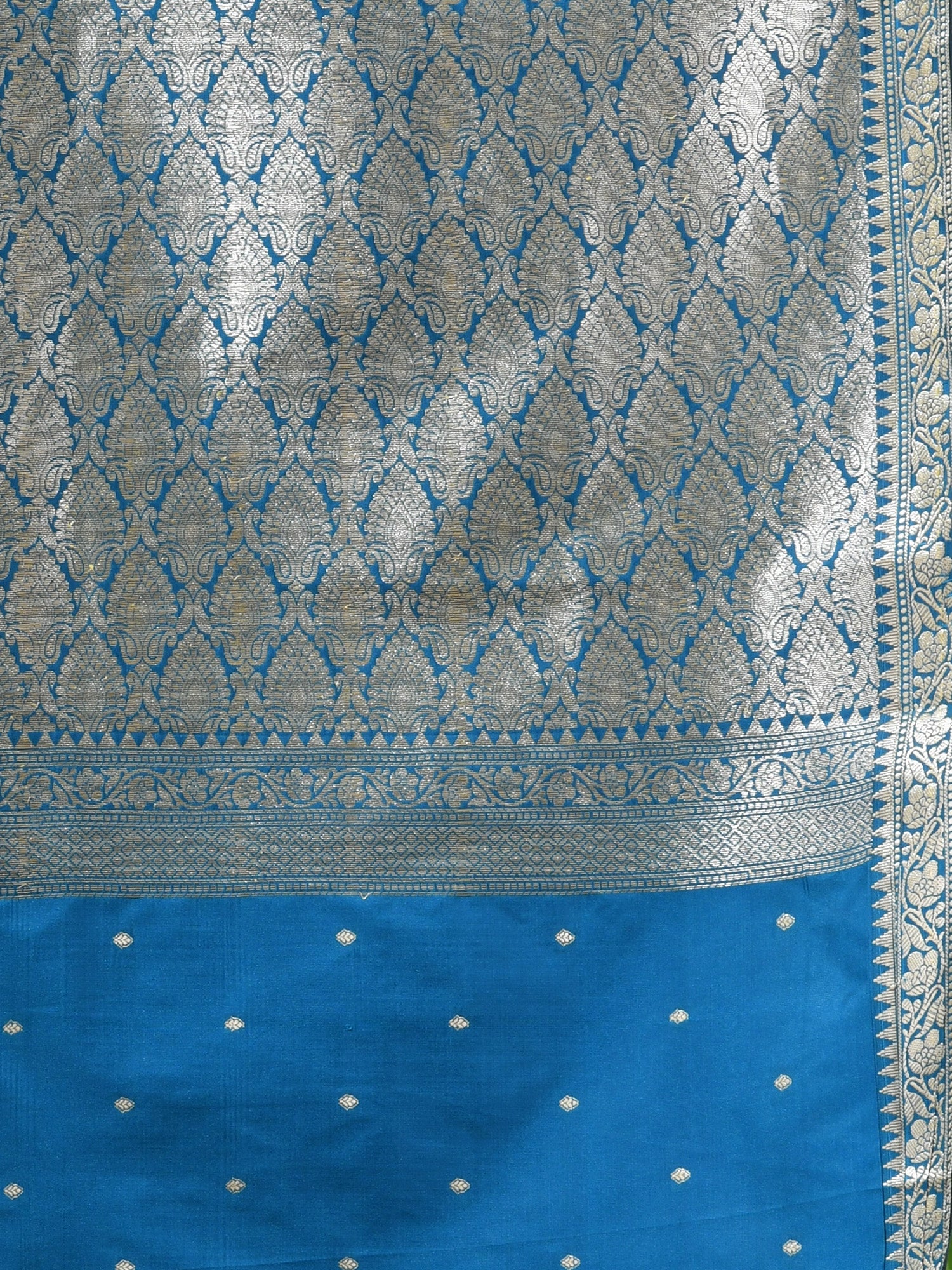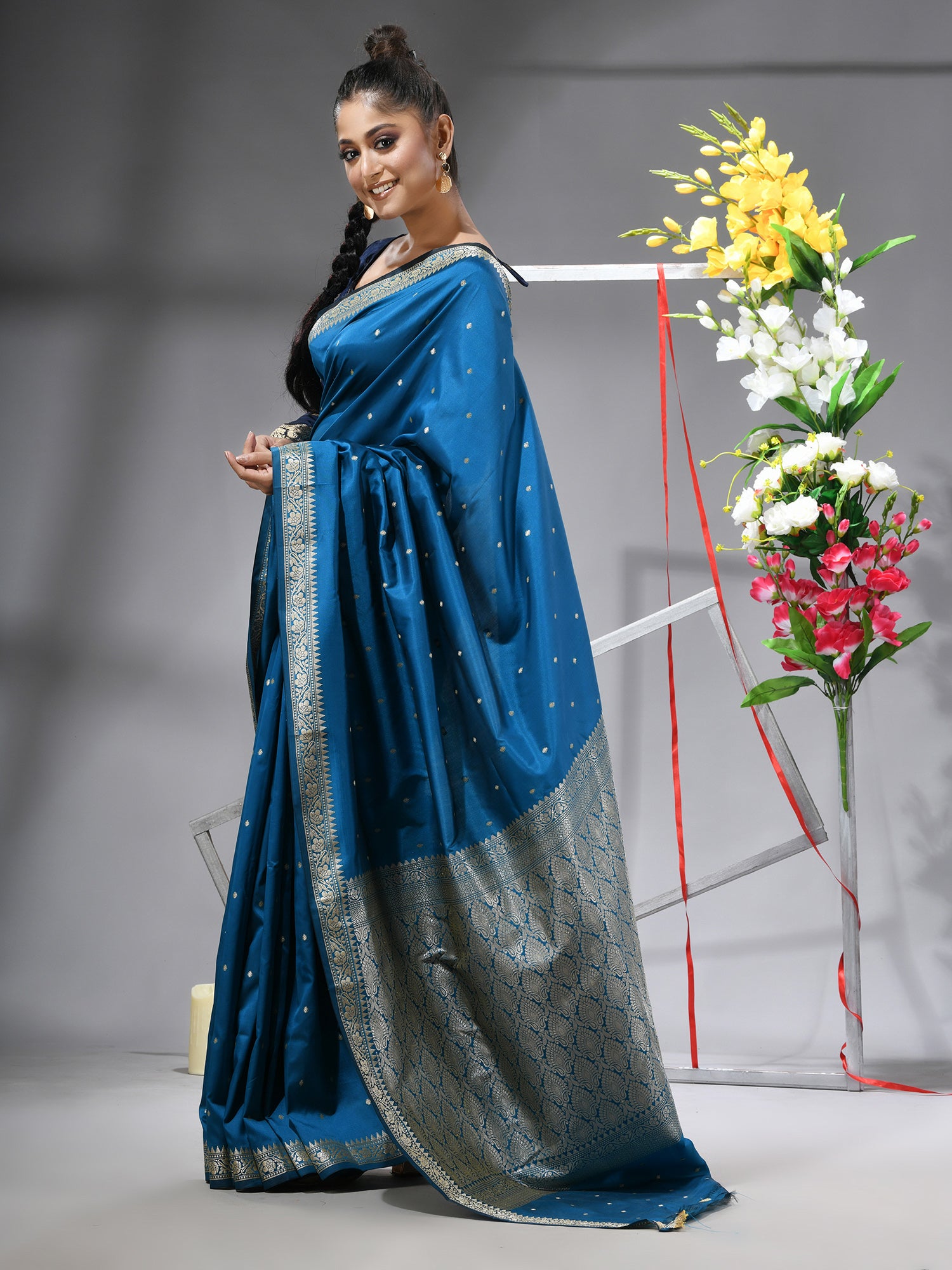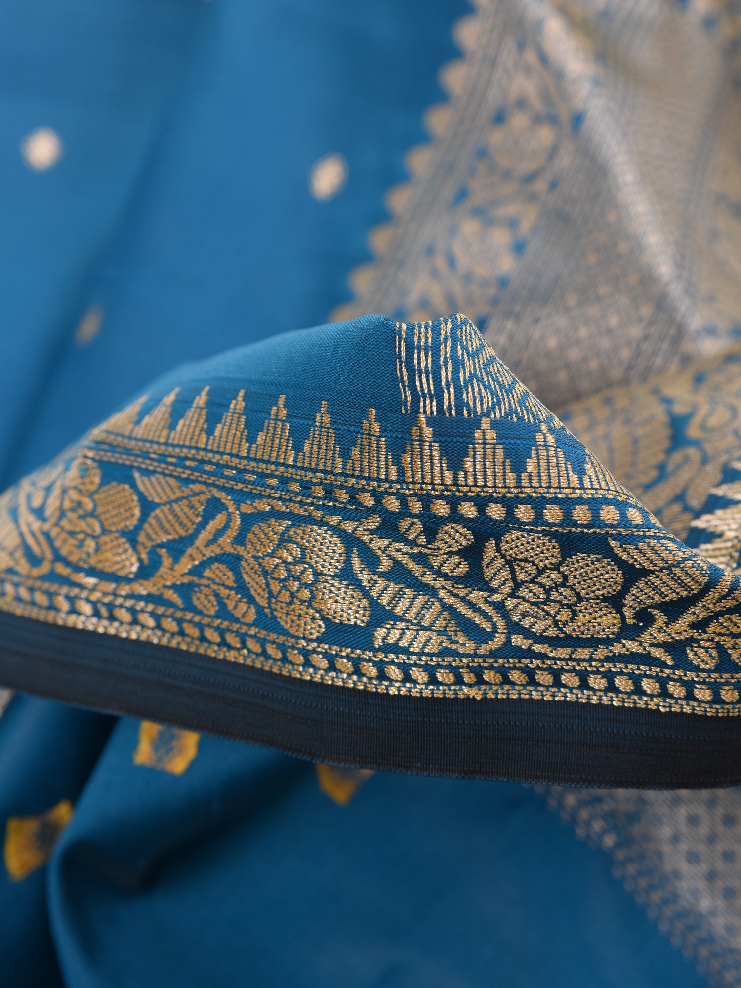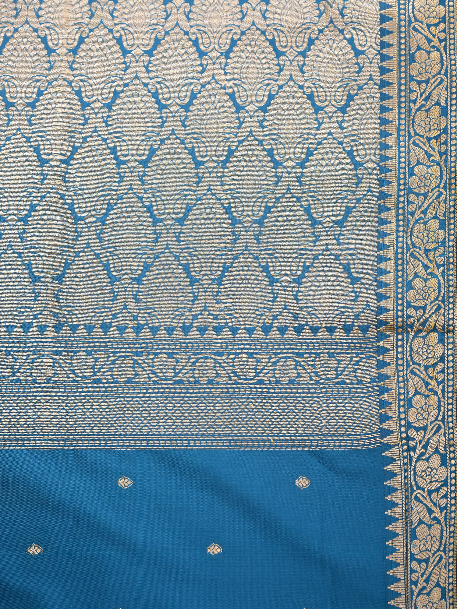 Immerse yourself in the captivating allure of the DESH BIDESH Blue Kanjivaram Kanchipuram Silk Blend Saree. This exquisite piece weaves together the tranquil beauty of blue with the timeless grandeur of Kanjivaram silk sarees and Kanchipuram sarees. Adorned with delicate silver zari butti work throughout its rich jacquard weave, this saree is a testament to traditional artistry. Crafted from a luxurious pure silk blend, it offers a graceful drape and an opulent feel. Ideal as a sophisticated wedding saree, a captivating blue saree for special events, or a cherished addition to your collection of pure silk sarees. Comes complete with a matching blouse piece.