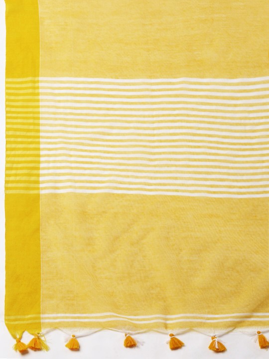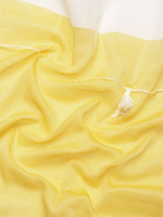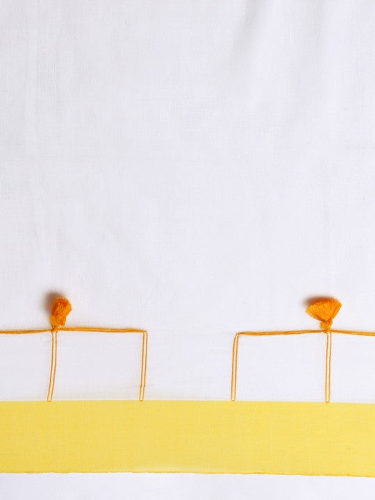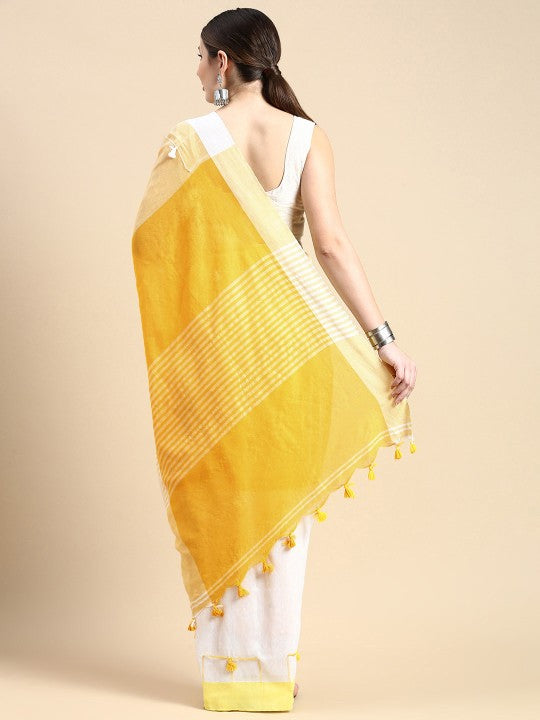 White and yellow taant saree. Colourblocked saree with woven design border. The saree comes with an unstitched blouse piece. The blouse worn by the model might be for modelling purpose only. Check the image of the blouse piece to understand how the actual blouse piece looks like.