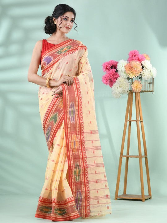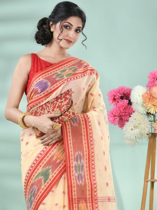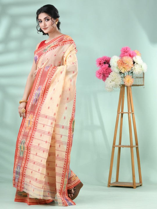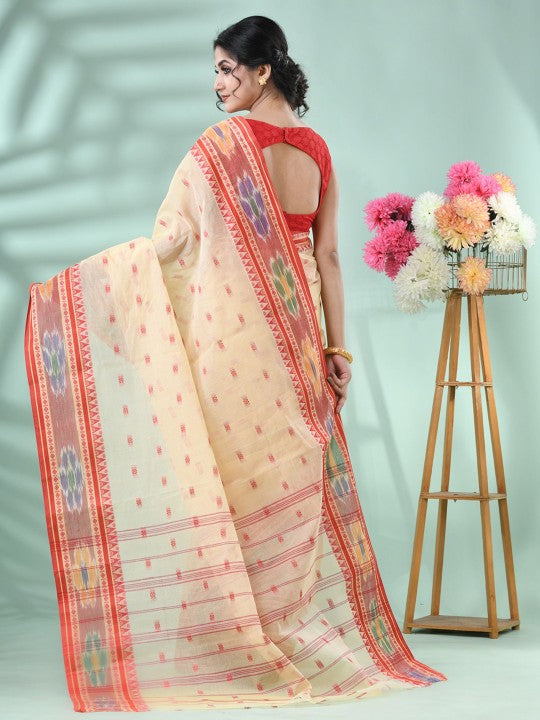 Beige & Red Floral Motifs Pure Cotton Saree with Blouse Piece