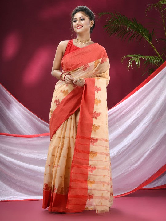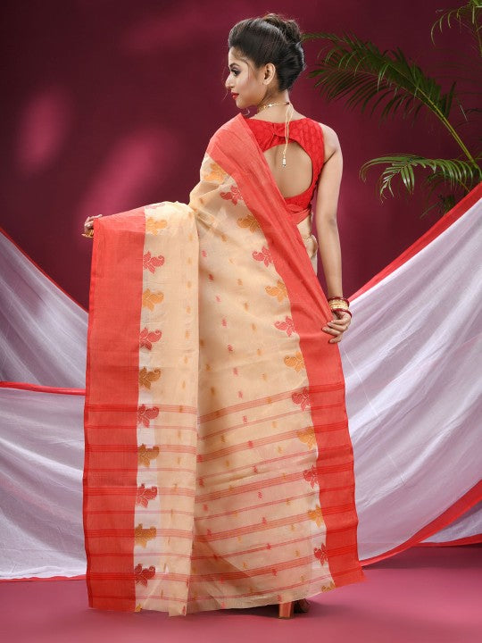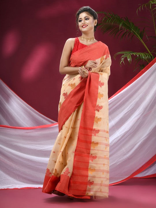Drape yourself in this lovely beige and red pure cotton saree, a timeless piece for any occasion. Its exquisite woven design adds a touch of traditional charm and elegance. The saree is crafted from pure cotton, ensuring comfort and breathability throughout the day. It comes with a matching blouse piece, allowing for a complete and coordinated ensemble. This saree is perfect for festive celebrations, family gatherings, or a casual day out, making you feel effortlessly graceful and chic.