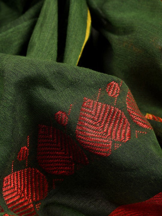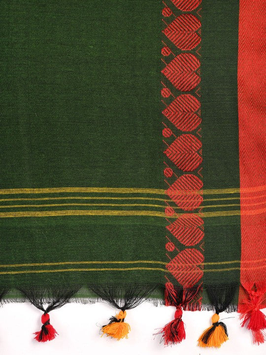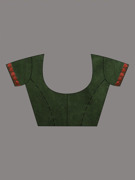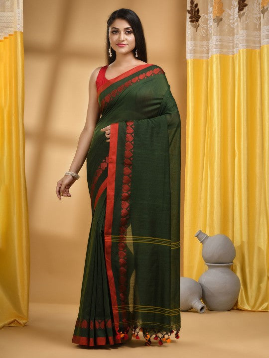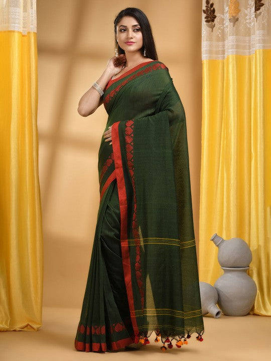 This elegant green and red taant saree features a classic solid design with a prominent solid border. It is adorned with intricate zari detailing, adding a touch of traditional opulence. Crafted from pure cotton, this handloom saree promises exceptional comfort and breathability for all-day wear. The ensemble includes an unstitched blouse piece, allowing for custom tailoring to achieve a perfect fit. Please note that the blouse worn by the model is for styling purposes; refer to the provided image of the blouse piece for its actual appearance. This saree is perfect for festive occasions, traditional gatherings, or everyday ethnic wear. Its vibrant colors and traditional weave make it a timeless addition to any wardrobe. The lightweight cotton fabric ensures easy draping and comfort in warmer climates. Dry cleaning is recommended to maintain the fabric's quality and intricate details. Embrace the rich heritage of Bengali handloom with this beautiful taant saree.