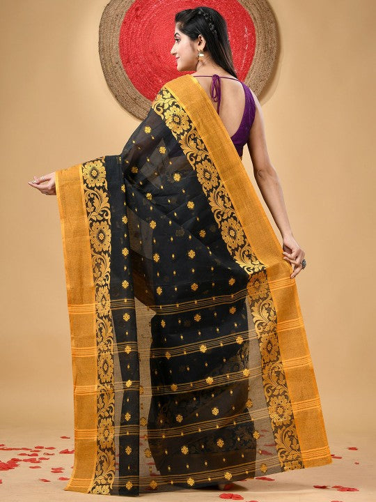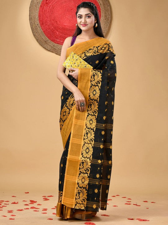 This exquisite saree, crafted from pure cotton, showcases a sophisticated blend of black and yellow with intricate ethnic woven motifs. The design features a distinctive woven border, adding to its traditional elegance. The saree measures approximately 5.5 meters in length and 1.05 meters in width, providing ample drape for various styling preferences. This piece does not include a blouse, allowing for personalized pairing to complete your ensemble. Dry clean care is recommended to preserve the fabric's integrity and the vibrancy of its colors. This saree is a testament to traditional craftsmanship, offering a graceful addition to any ethnic wear collection. Its pure cotton composition ensures comfort and breathability, making it suitable for diverse occasions. The subtle yet striking color combination and detailed weaving highlight its refined aesthetic. This garment exemplifies classic Indian textile artistry, perfect for those who appreciate cultural richness and timeless design.