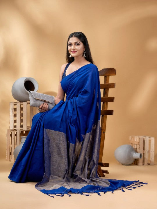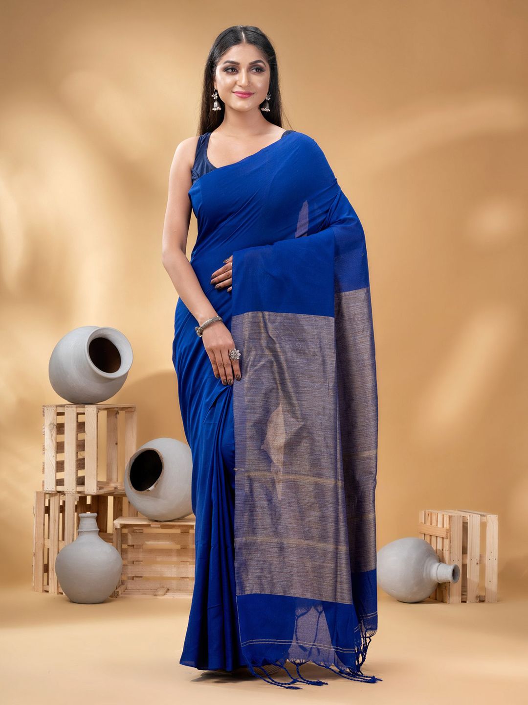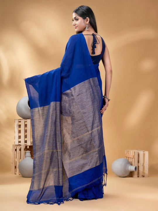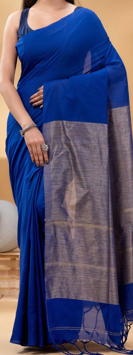 Experience timeless elegance with this exquisite Blue and Gold-Toned Woven Design Pure Cotton Saree. Crafted from premium pure cotton, this saree offers unparalleled comfort and a luxurious drape, perfect for various occasions. The intricate woven design, devoid of a border, ensures a sophisticated and contemporary appeal, making it a versatile addition to your ethnic wardrobe. This saree embodies traditional craftsmanship blended with modern aesthetics, ideal for both festive gatherings and everyday wear. Its breathable fabric ensures comfort throughout the day, making it a practical yet stylish choice. The rich blue hue, complemented by subtle gold tones, creates a captivating visual impact. This piece reflects a heritage of quality textile production, promising durability and enduring charm. Embrace the graceful silhouette and refined artistry of this meticulously crafted pure cotton saree. It is designed to enhance your natural beauty and provide a distinguished presence. This saree is a testament to superior design and material integrity.