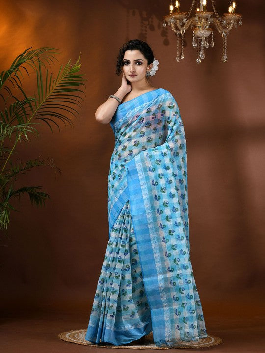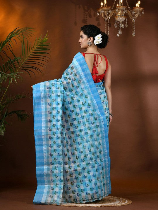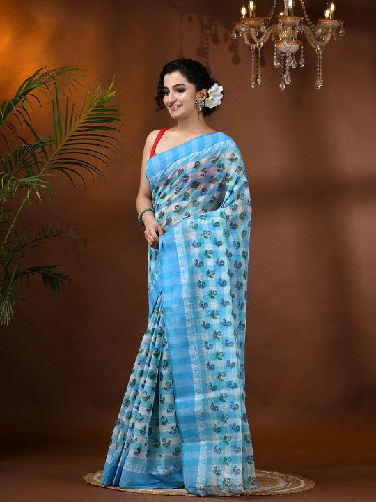 Blue Floral Printed Pure Cotton Block Print Saree with Woven Border