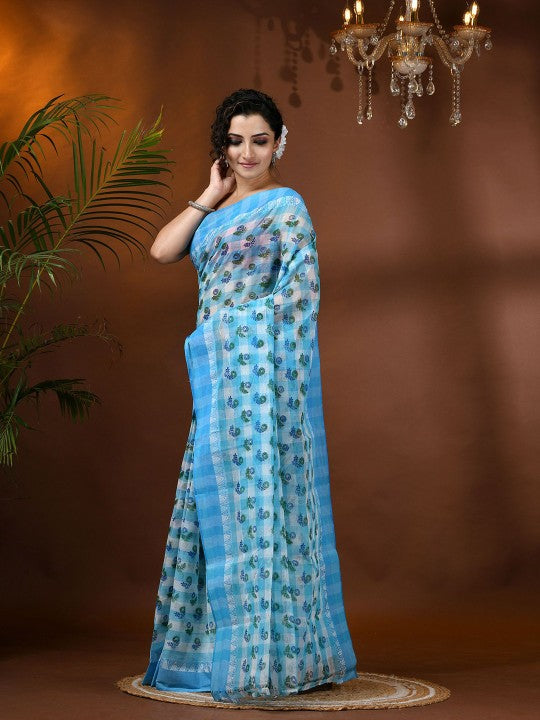 | Design Details | Blue and green block print saree, floral printed saree with woven design border |