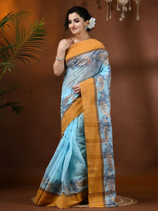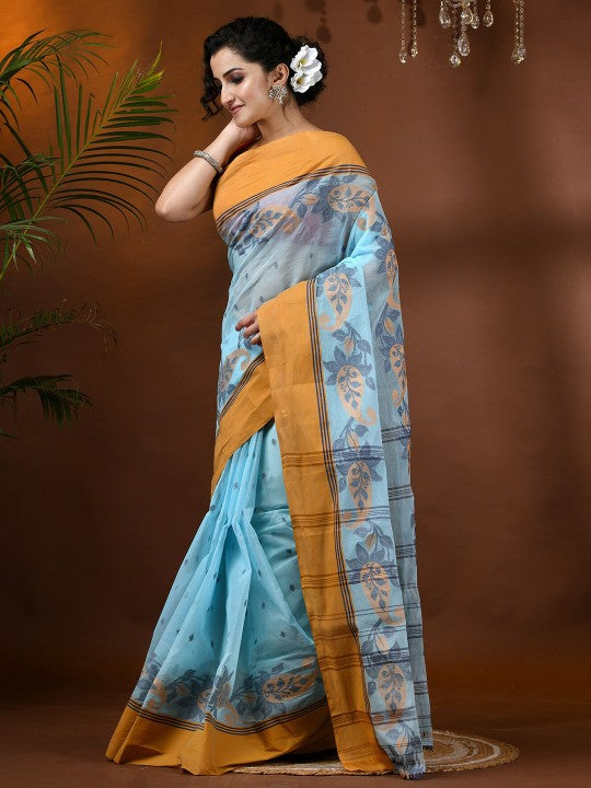 This blue and orange taant saree features a paisley woven design with a solid border. Saree fabric is made from pure cotton. The saree is dry clean only. It is available in various sizes and has received positive reviews for its fabric quality and matching product photos.
