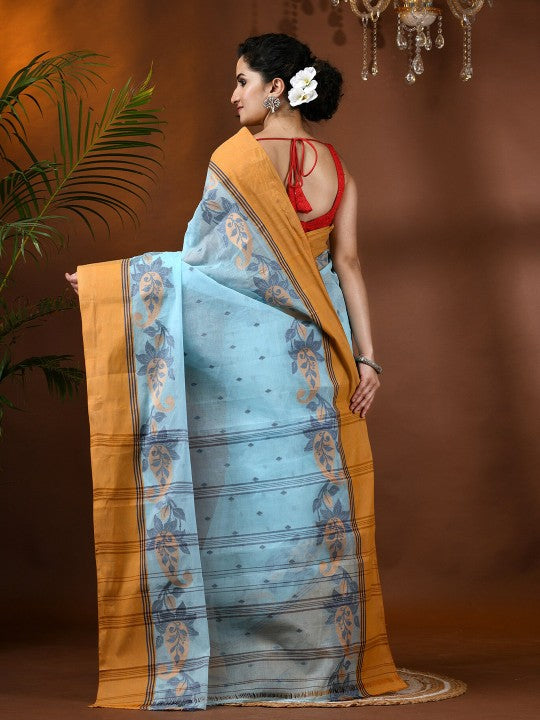 Blue Paisley Pure Cotton Taant Saree with Solid Border and Orange Pallu for Women