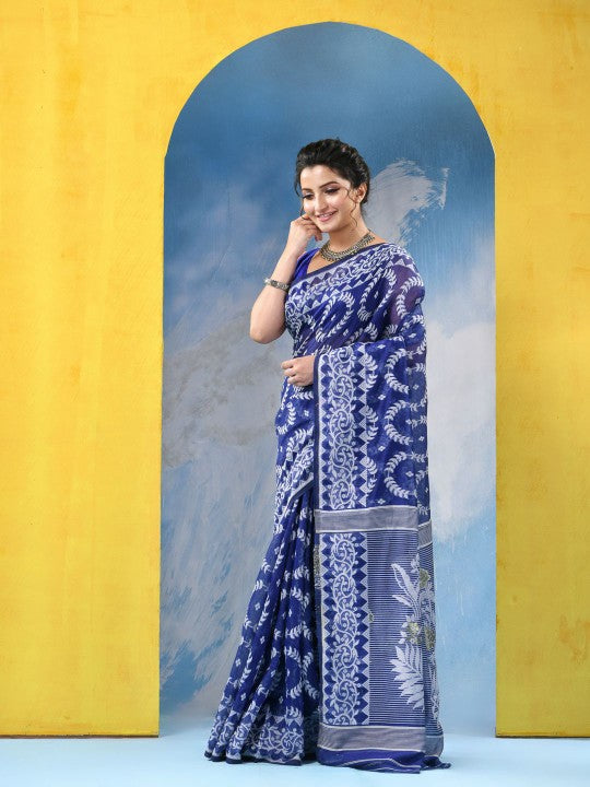 Blue & White Woven Design Zari Jamdani Saree with Border