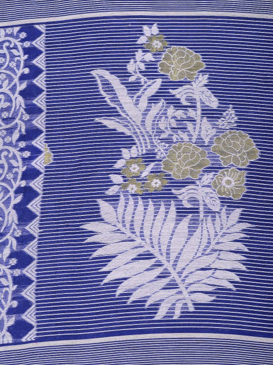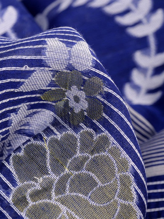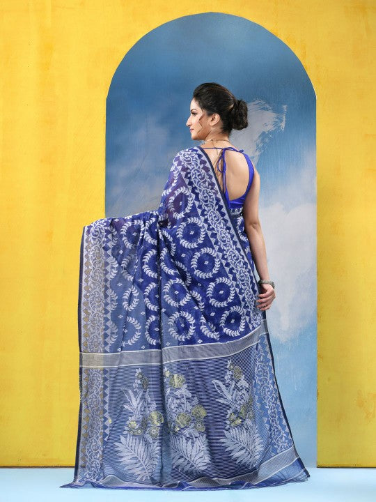 | Design Details | Blue and white jamdani saree with woven design border and zari detail |