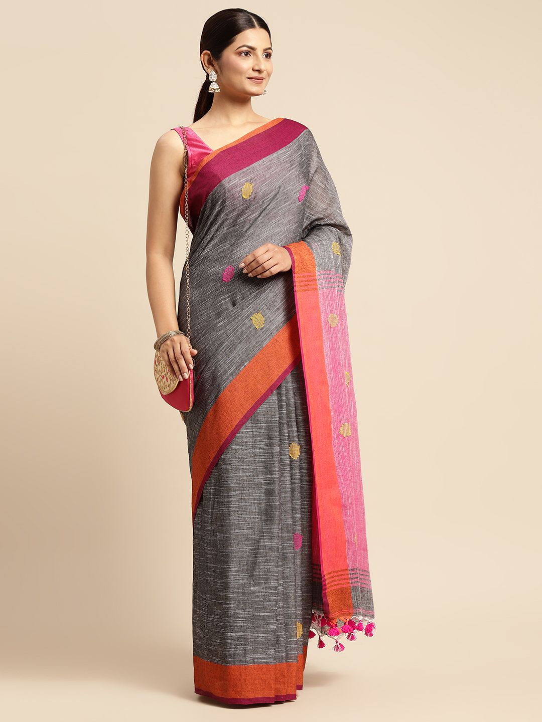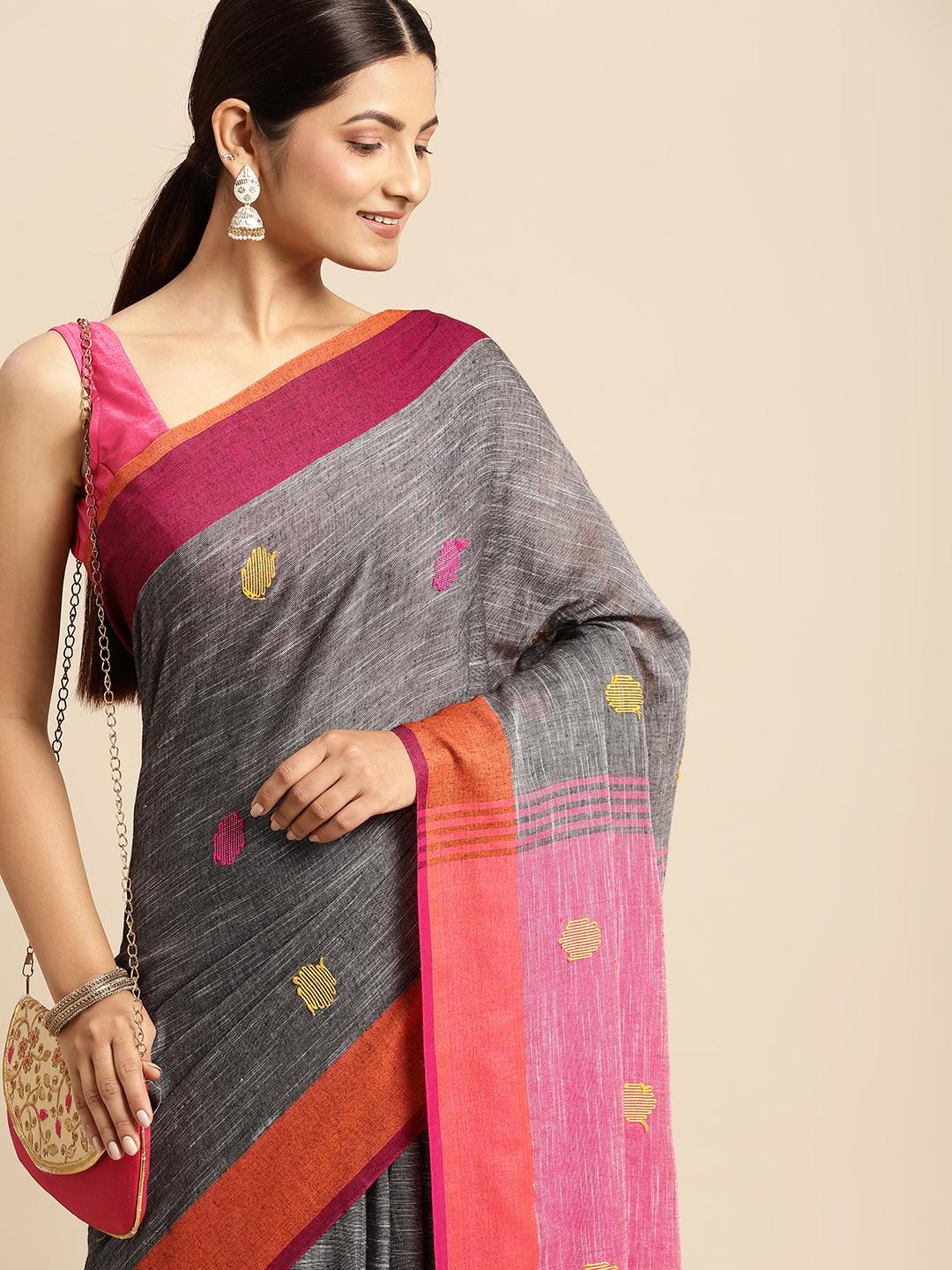 Buy DESH BIDESH Charcoal Grey & Pink Geometric Design Pure Cotton Taant Saree - Sarees for Women from DESH BIDESH at Rs. 1148. Style ID: 20487988. This charcoal grey and pink taant saree features a geometric woven design with a solid border. Disclaimer: The saree comes with an unstitched blouse piece. The blouse worn by the model might be for modelling purpose only. Check the image of the blouse piece to understand how the actual blouse piece looks like.