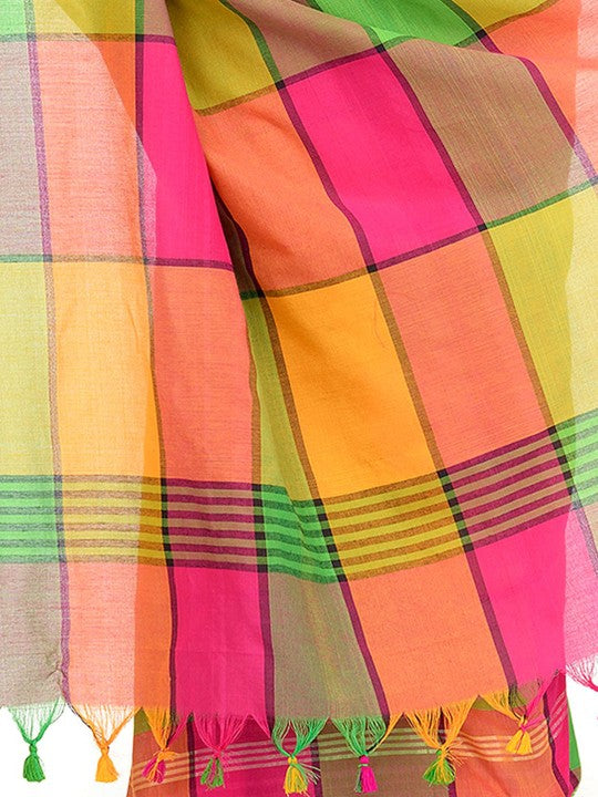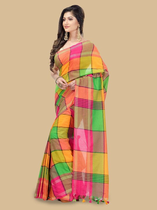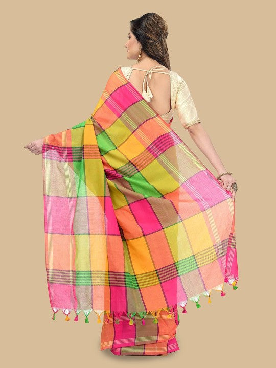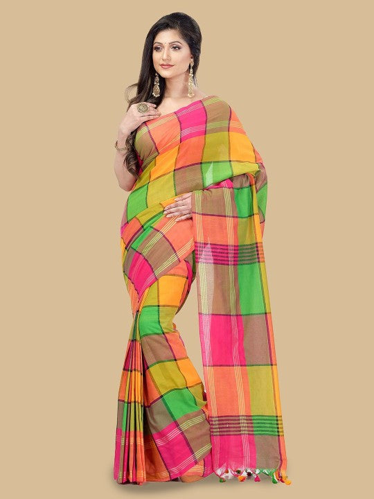 Green and pink taant saree. Checked saree with solid border. The saree comes with an unstitched blouse piece. The blouse worn by the model might be for modelling purpose only. Check the image of the blouse piece to understand how the actual blouse piece looks like.