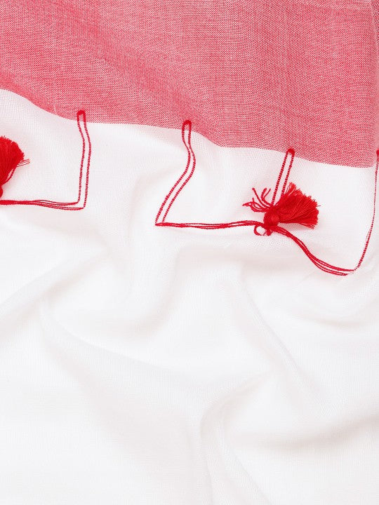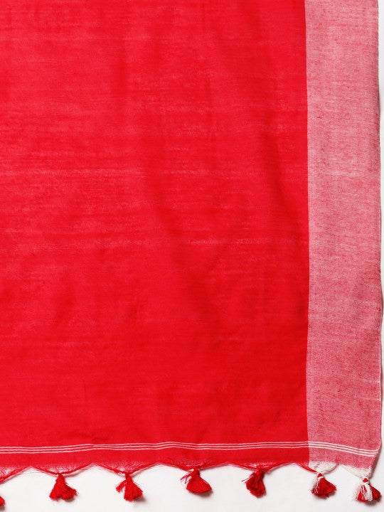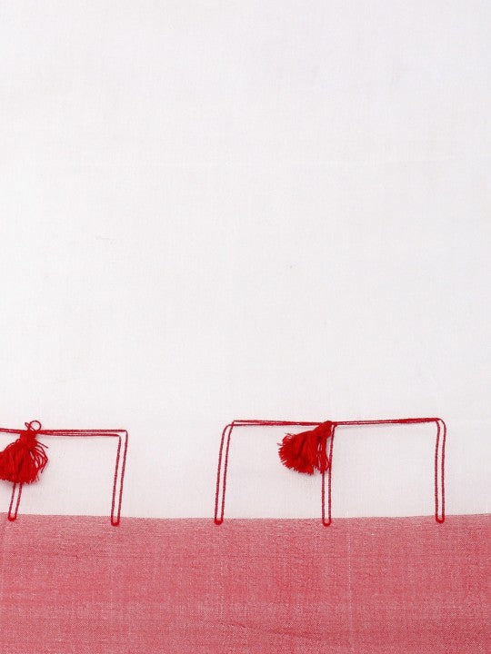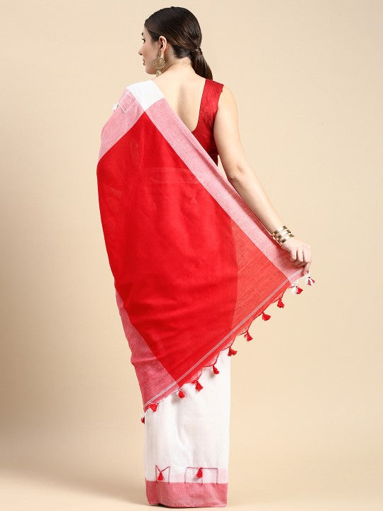 This DESH BIDESH Colourblocked Pure Cotton Taant Saree features a striking red and white design. It is a colourblocked saree with an elegant woven design border. The set includes an unstitched blouse piece, allowing for custom tailoring. Please note that the blouse worn by the model is for styling purposes only. Refer to the image of the blouse piece to visualize its actual appearance.