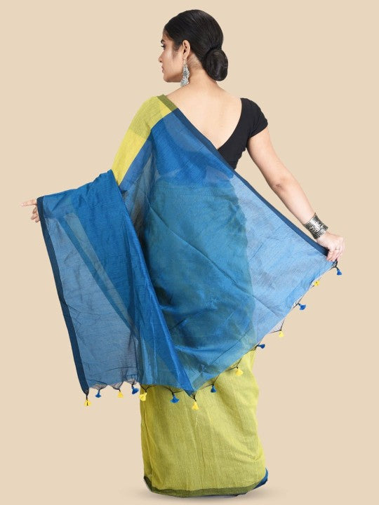 Olive green and blue saree. Colourblocked saree with solid border. The saree comes with an unstitched blouse piece. The blouse worn by the model might be for modelling purpose only. Check the image of the blouse piece to understand how the actual blouse piece looks like.