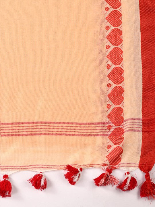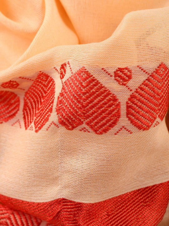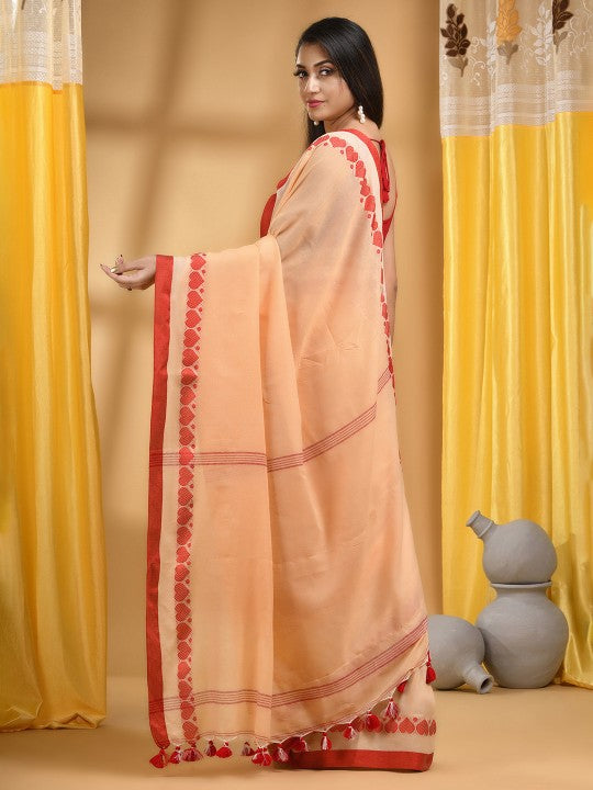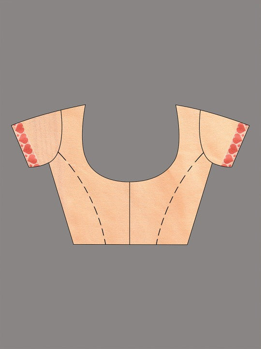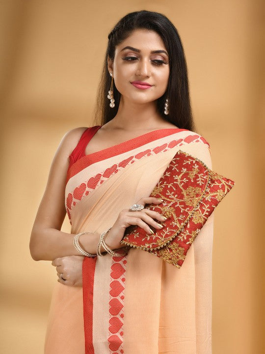 Description This exquisite DESH BIDESH Taant Saree showcases a charming cream-coloured and coral palette. Expertly crafted from pure cotton, it offers exceptional comfort and a graceful drape suitable for various occasions. The saree's solid body is beautifully accentuated by an intricately woven border featuring a delicate heart design. An unstitched blouse piece is included, providing the flexibility for a custom-tailored fit. This lightweight saree is perfect for extended wear, ensuring ease throughout your day. Its timeless design seamlessly blends traditional aesthetics with a touch of modern appeal. Elevate your ethnic wardrobe with this finely woven textile, ideal for festive gatherings or daily elegance. To maintain its pristine quality, dry cleaning is recommended. The saree measures approximately 19 feet 9 inches in length, including the blouse piece. Its ample width of about 3 feet 6 inches allows for a stunning and elegant silhouette.