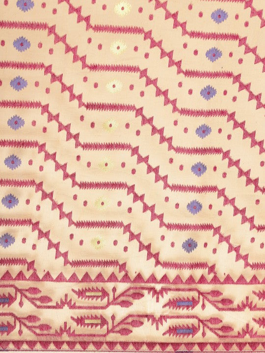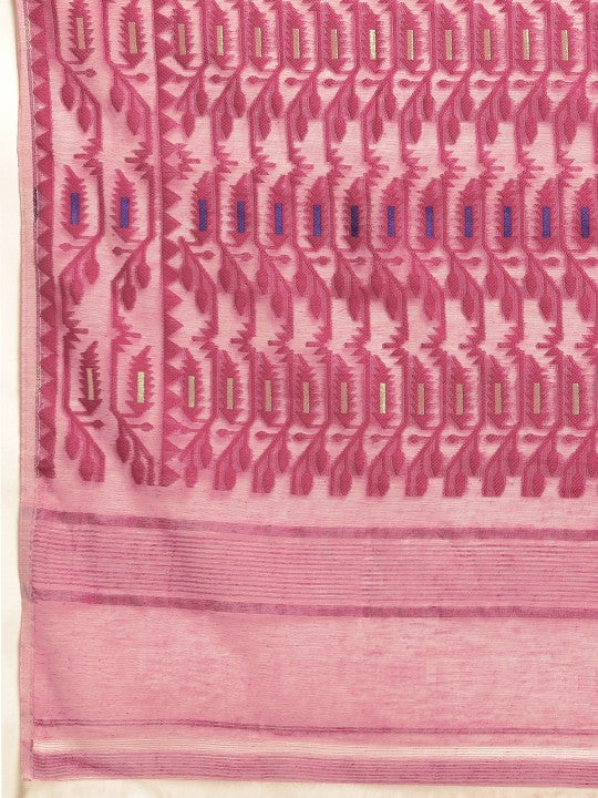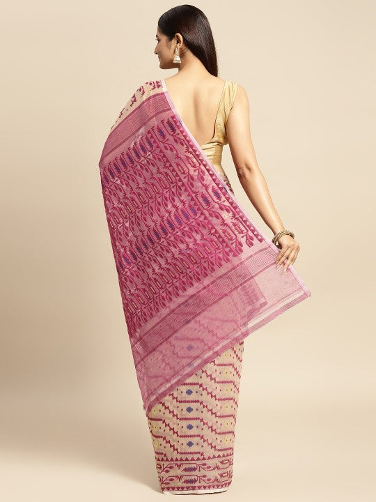 This exquisite cream-coloured Jamdani saree from DESH BIDESH showcases a beautiful woven design. Crafted from pure cotton, it ensures exceptional comfort and breathability throughout the day. The saree features a borderless design, offering a modern yet traditional aesthetic. Its vibrant magenta accents are intricately woven, adding a touch of elegance. This versatile piece is perfect for various occasions, from festive celebrations to casual gatherings. Please note, the saree does not include a separate blouse piece. The model's blouse is for styling inspiration only. Embrace the rich heritage of Indian textiles with this stunning creation. Its lightweight fabric drapes beautifully, enhancing your silhouette. This saree is a testament to traditional craftsmanship, making it a valuable addition to your ethnic wardrobe.