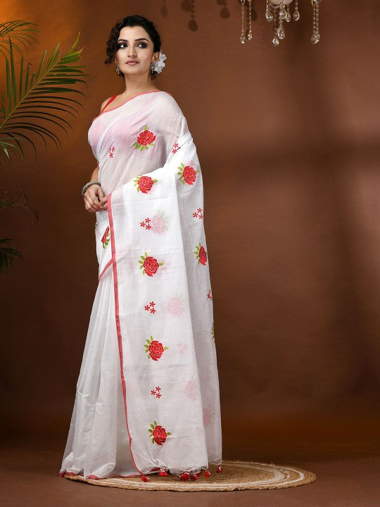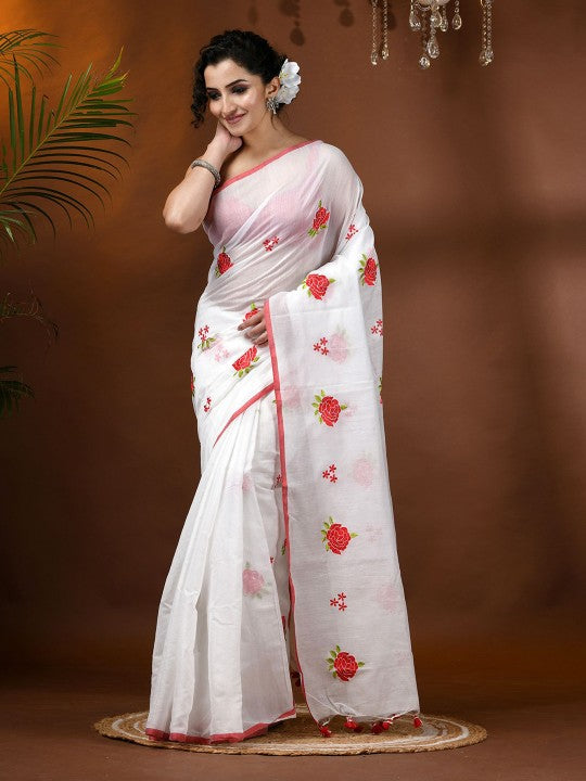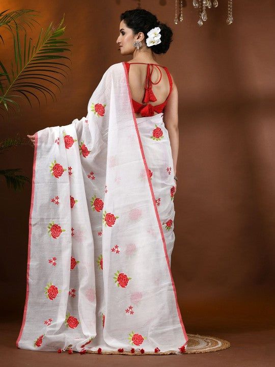Elegant Floral Embroidered White Cotton Blend Saree with Blouse Piece