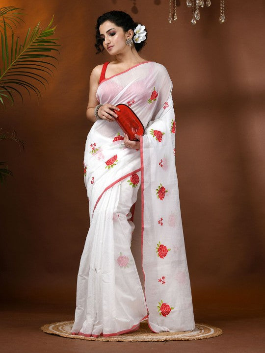 This exquisite white saree, crafted from a luxurious cotton blend, features delicate floral embroidery and a contrasting solid border, offering a sophisticated aesthetic. The design is meticulously detailed, showcasing traditional craftsmanship with a contemporary appeal. It includes an unstitched blouse piece, allowing for custom tailoring to achieve a perfect fit. The saree's lightweight and breathable fabric ensures comfort for extended wear, making it suitable for various occasions. Its elegant drape enhances the wearer's silhouette, providing a graceful and refined look. The vibrant red floral motifs add a captivating touch of color against the pristine white. This piece is ideal for festive celebrations, formal events, or cultural gatherings. It represents a harmonious blend of classic Indian attire and modern design sensibilities. The saree is easy to maintain with hand washing, ensuring its longevity and pristine condition.