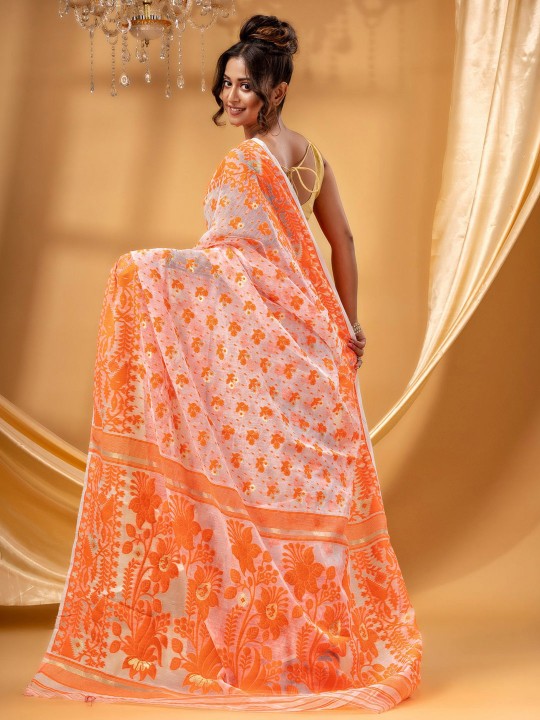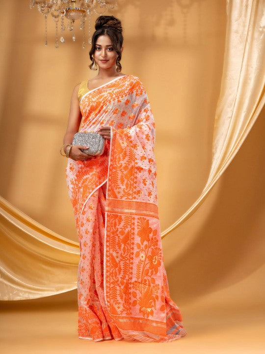 Experience the timeless elegance of the DESH BIDESH Floral Woven Jamdani Saree. Crafted from premium pure cotton, this exquisite saree offers exceptional comfort and breathability. It features an intricate floral woven design, showcasing the rich heritage of Jamdani weaving. A delicate zari border enhances its traditional appeal, adding a touch of sophisticated shimmer. This saree exemplifies artisanal craftsmanship, making it a distinguished addition to any wardrobe. Its vibrant orange and white palette ensures a striking visual presence. Perfect for festive occasions, cultural gatherings, or everyday elegance, this piece drapes beautifully. The pure cotton fabric ensures ease of wear throughout the day. Please note, the saree does not include a blouse piece. This garment embodies both cultural richness and contemporary style.