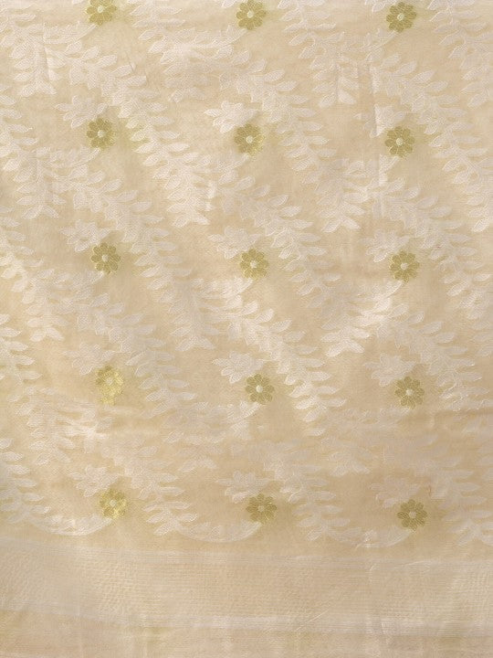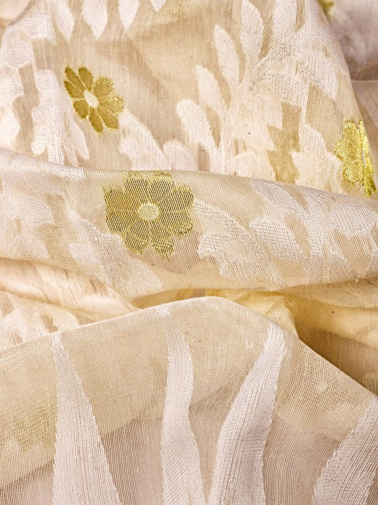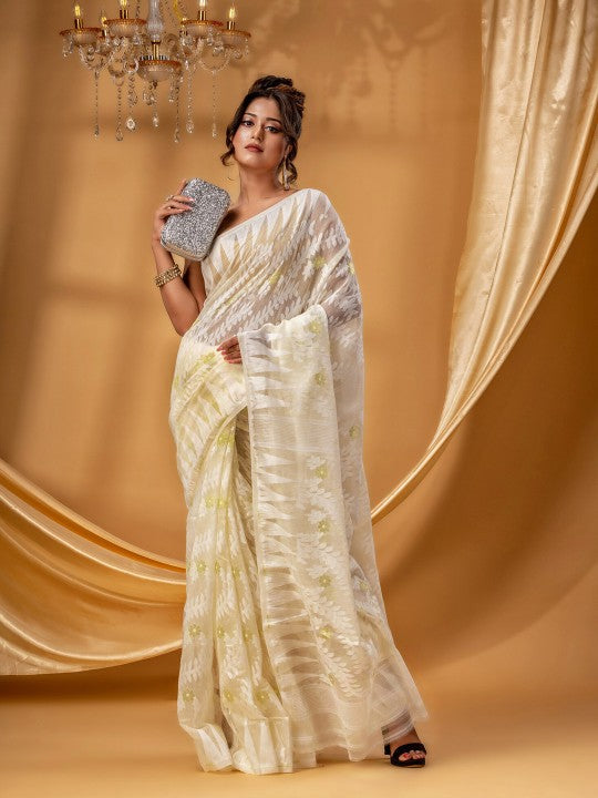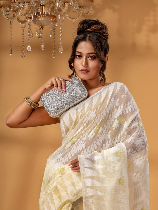 Experience the timeless elegance of the DESH BIDESH Off-White and Gold-Toned Jamdani Saree, an embodiment of traditional Indian craftsmanship. This exquisite pure cotton saree features an intricate floral woven design, accentuating its rich cultural heritage. The delicate zari details along the border add a touch of refined opulence, making it ideal for celebratory occasions. Crafted from breathable pure cotton, it ensures comfort throughout prolonged wear. This piece beautifully merges classic aesthetics with contemporary appeal, offering unparalleled grace. It is a testament to the artistry of Jamdani weaving, showcasing meticulous patterns. Elevate your ethnic wardrobe with this distinguished and effortlessly chic garment.