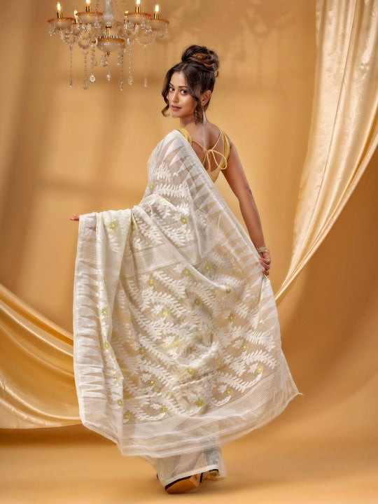 Tamarind Leaf Resham Dhakai Jamdani Pure Cotton Handloom Saree without Blouse Piece