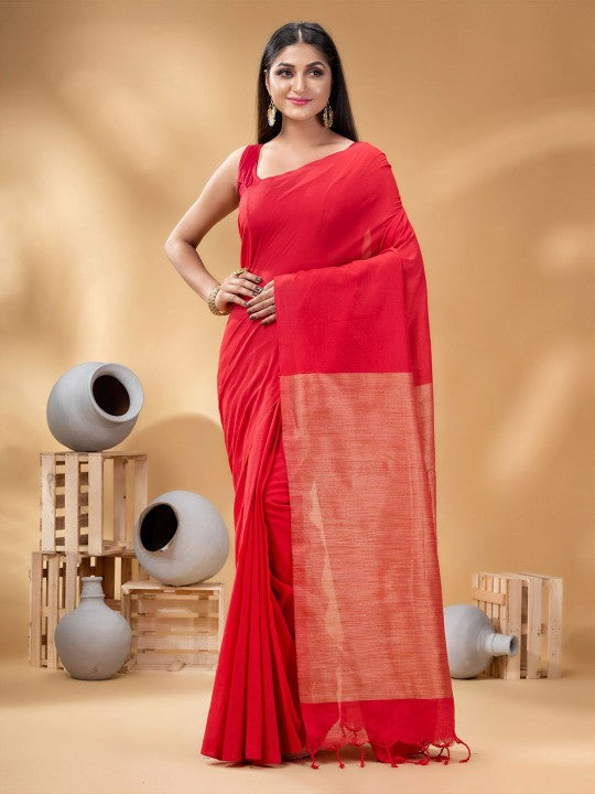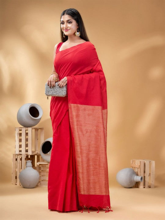 This exquisite DESH BIDESH Red Pure Cotton Solid Saree represents a timeless aesthetic, meticulously crafted for the discerning individual. The saree features a solid pattern, devoid of a border, allowing for versatile styling and a clean, sophisticated drape. Constructed from pure cotton, it ensures exceptional breathability and comfort throughout the day. Its inherent elegance makes it suitable for a wide array of occasions, from casual gatherings to more formal events. The fabric's natural sheen enhances its visual appeal, providing a subtle luminosity. This garment exemplifies traditional Indian craftsmanship, offering both durability and ease of maintenance. The rich red hue adds a vibrant touch, ensuring the wearer stands out with refined grace. A true embodiment of cultural heritage and contemporary design, this saree is a valuable addition to any wardrobe.